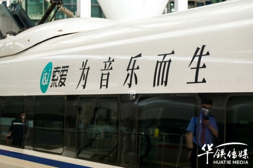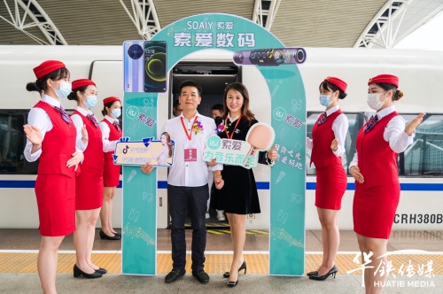 10月28日上午,索愛集團(tuán)董事長劉建佳、總經(jīng)理全雪梅、華鐵傳媒集團(tuán)廣州分公司銷售總經(jīng)理劉延群等領(lǐng)導(dǎo)嘉賓共同為冠名發(fā)車儀式揭幕、剪彩、互贈紀(jì)念禮品,在現(xiàn)場嘉賓的共同見證下,張貼索愛全新品牌代言人陳小春夫婦形象宣傳海報(bào)的“索愛-為音樂而生”高鐵冠名列車正式啟程。