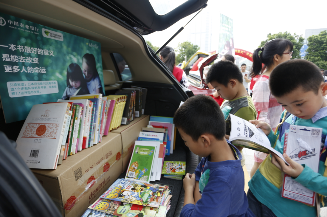 本次活動(dòng)將車尾箱作為展臺(tái),活動(dòng)參與者按照1:1進(jìn)行舊書交換,或到深圳農(nóng)行現(xiàn)場(chǎng)設(shè)置的捐書點(diǎn)捐獻(xiàn)舊書,每捐出五本舊書,可獲得由農(nóng)行送出的10元書劵?;顒?dòng)吸引來自錦田小學(xué)、深圳實(shí)驗(yàn)學(xué)校中學(xué)部及深圳新聞網(wǎng)網(wǎng)友共40多個(gè)家庭參與,僅兩個(gè)小時(shí)便交出漂亮的“成績(jī)單”,現(xiàn)場(chǎng)交換圖書900多本,捐贈(zèng)愛心書籍1000余本。
