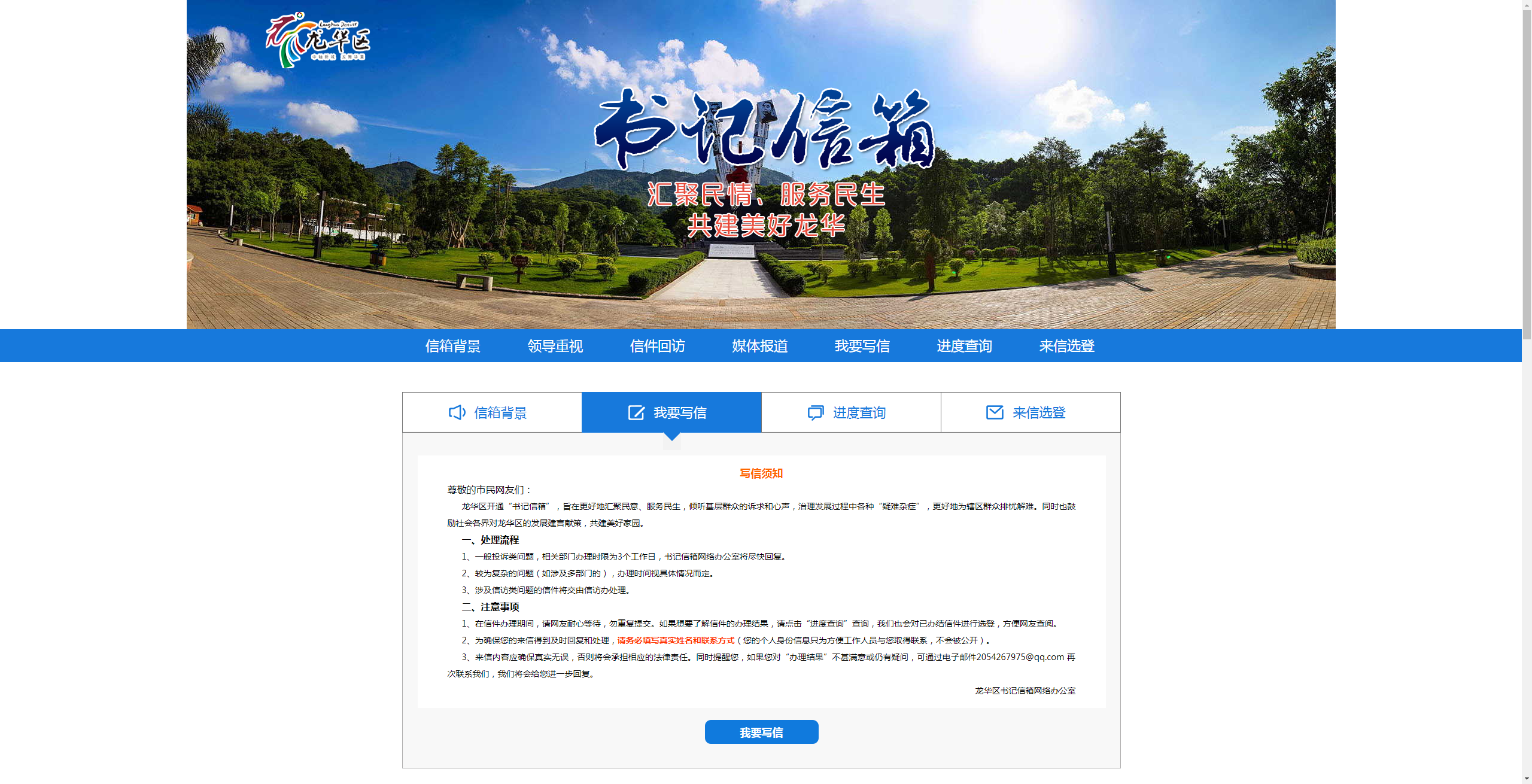 龍華區(qū)“書記信箱”網(wǎng)絡平臺是由龍華區(qū)領導的指導下搭建的網(wǎng)絡信息平臺,由深圳新聞網(wǎng)團隊進行開發(fā)搭建?!皶浶畔洹钡臉嫿ǎ驱埲A區(qū)委貫徹落實黨的群眾路線,踐行“三嚴三實”的一項新舉措?!皶浶畔洹弊?015年10月31日正式上線以來,逐步成為龍華市民向龍華區(qū)委反映、提出建議、意見和投訴請求的重要渠道。