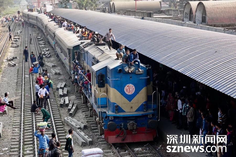 從達(dá)卡到邁門辛的火車是國內(nèi)最擁擠的線路之一,通常有數(shù)千名旅客擠在載客人數(shù)只有650人的火車?yán)?,有的抓著把手,有的蹲在門口,要不就蹲在車箱間的聯(lián)軸上或坐在車頂上。李仁奇攝