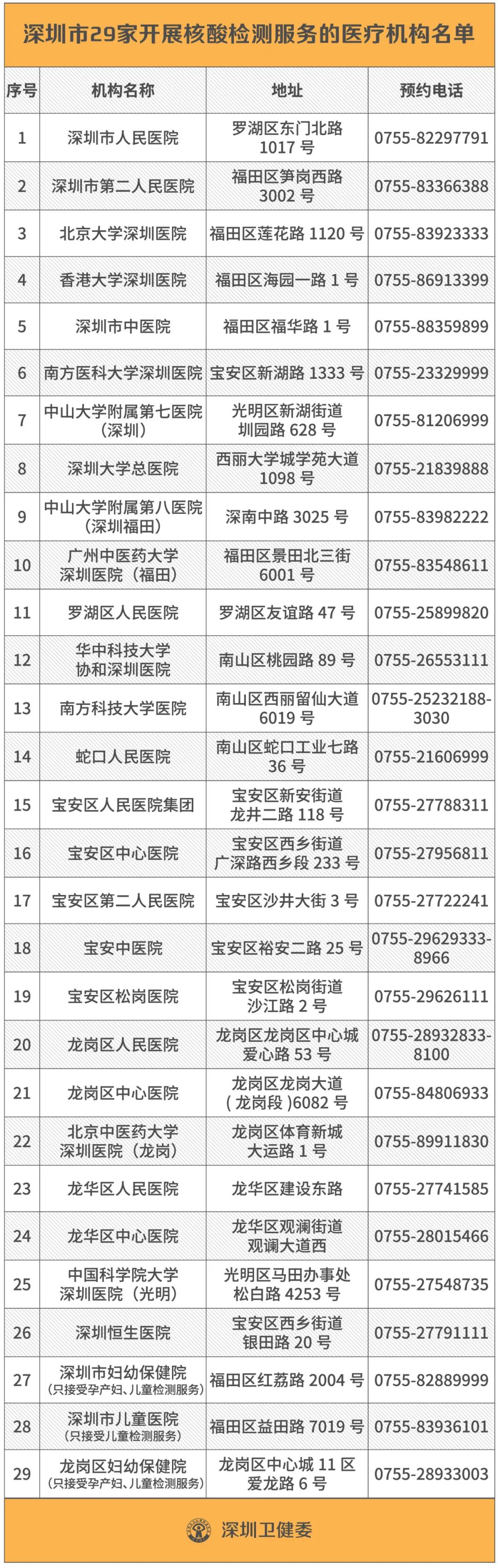 跨境學(xué)生可聯(lián)系全市提供核酸檢測的29家醫(yī)療機(jī)構(gòu)(詳見附件,含醫(yī)院名稱、地址和聯(lián)系電話)中的任意一家進(jìn)行檢測,部分醫(yī)院有預(yù)約要求,部分醫(yī)院對(duì)檢測服務(wù)時(shí)間有限定,因此首次前往檢測前,請(qǐng)先拔打聯(lián)系電話了解醫(yī)院是否需要預(yù)約和服務(wù)時(shí)間安排。