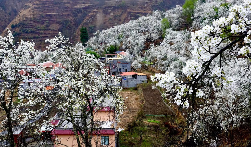 梨花叢中的村寨。李仁奇 攝