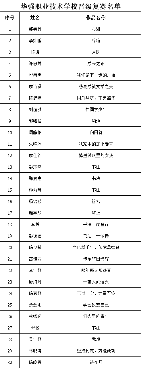 自2021年1月,活動征稿啟動以來,獲得了深圳市廣大中小學(xué)生、教師、文學(xué)愛好者的熱烈響應(yīng)積極參與,吸引了深圳百余所學(xué)校的上萬人關(guān)注報(bào)名。現(xiàn)公布福田區(qū)華強(qiáng)職業(yè)技術(shù)學(xué)校專場晉級復(fù)賽名單如下: