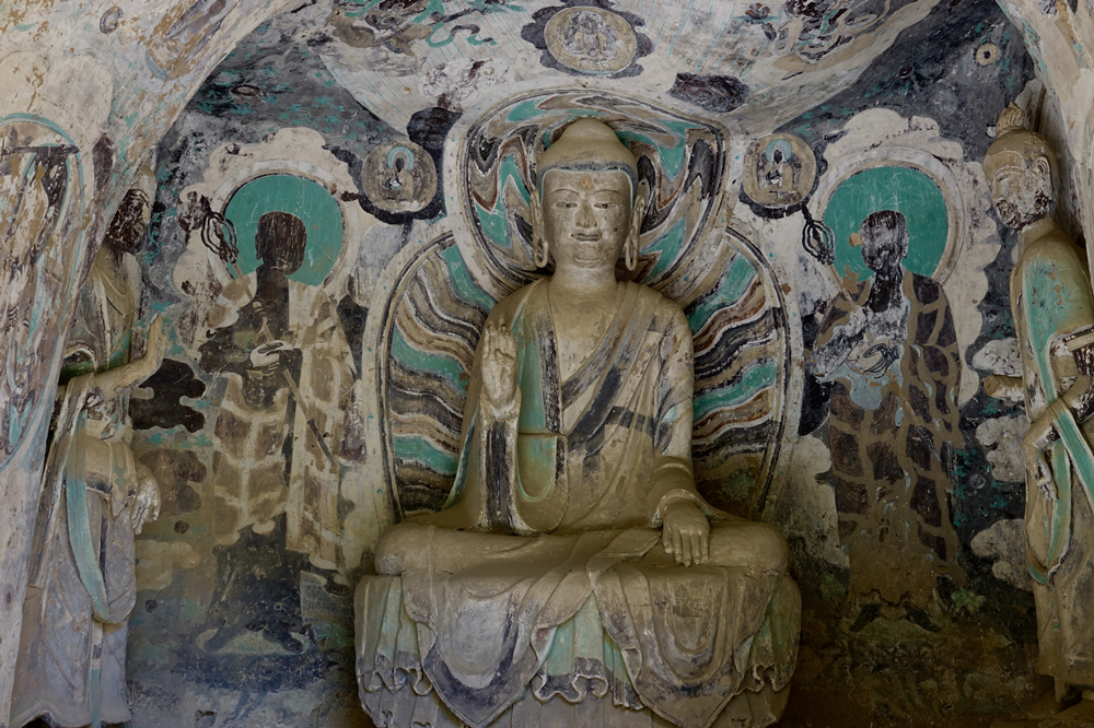 佛像左上方為169窟,169窟為一天然大洞穴,是現(xiàn)存最重要石窟,窟內(nèi)存西秦時的造像和壁畫。李仁奇 攝