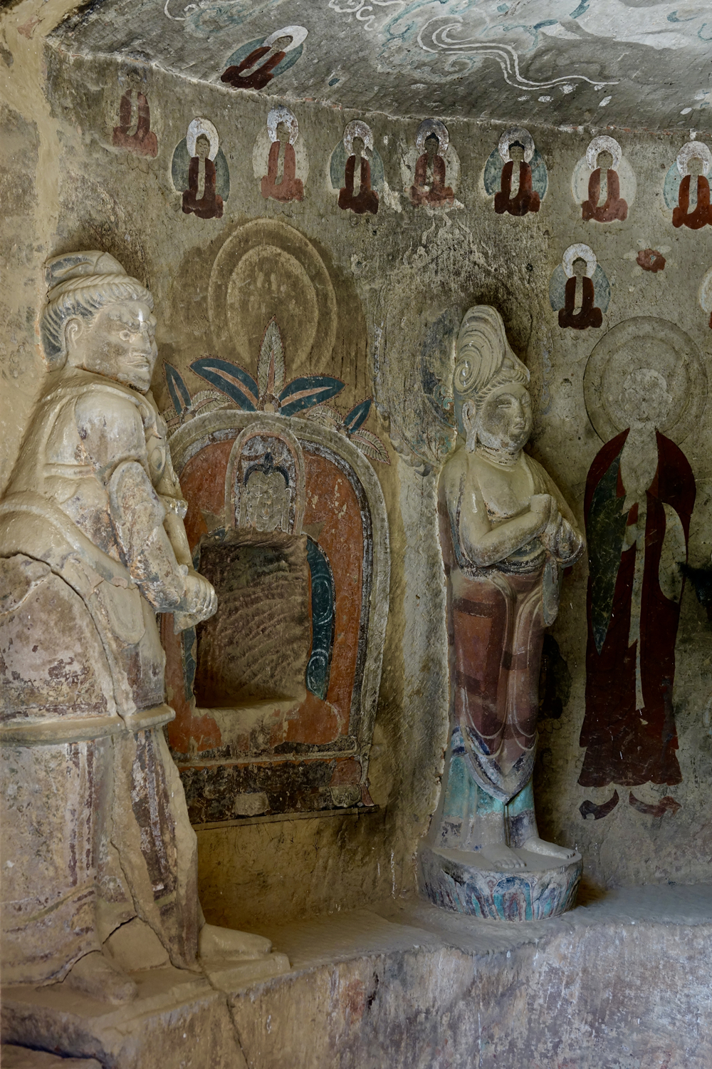 82窟,一結(jié)跏趺坐佛二脅侍菩薩,佛左右壁畫二弟子??唔敽烷T道露出底層,為北周原作,表層壁畫為明代重繪。李仁奇 攝