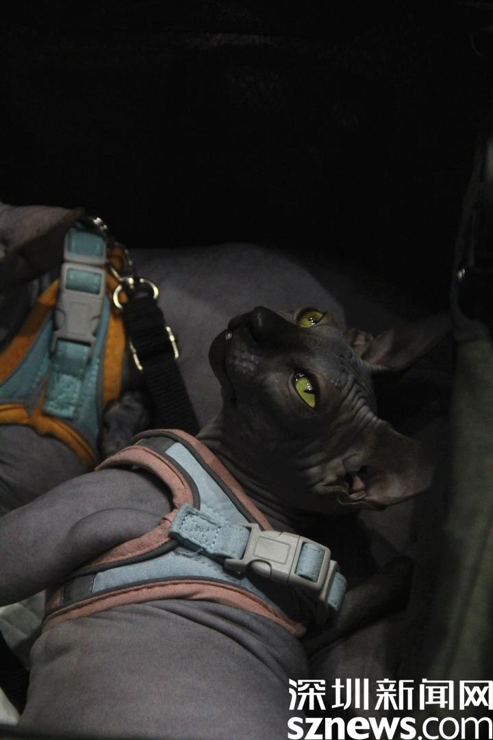 黏人的無毛貓與主人一同逛展。