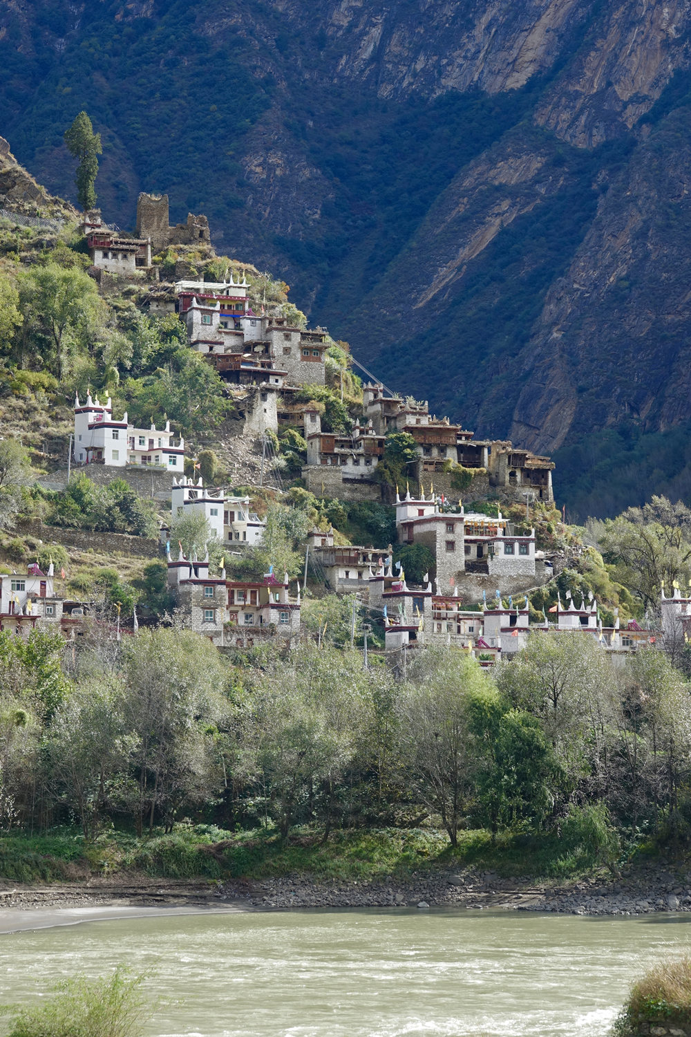屋頂四個(gè)角落有白色的小佛塔,代表著山、樹(shù)、水、地四方神的四角,上面還插著經(jīng)幡,每逢節(jié)日會(huì)進(jìn)行祭祀,代表著嘉絨藏族的民俗風(fēng)情。李仁奇 攝