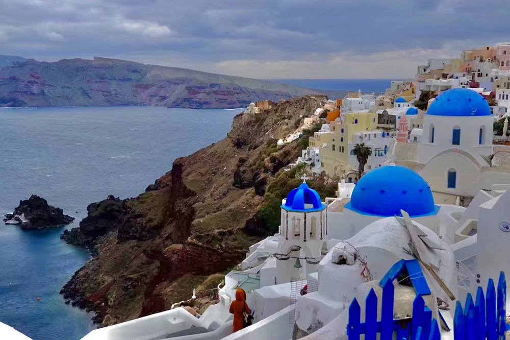 小鎮(zhèn)上依山而建的白色房屋,藍(lán)色穹頂,其間還點(diǎn)綴著紅、黃、粉以及無(wú)數(shù)種漸變的顏色,錯(cuò)落有致。李仁奇 攝