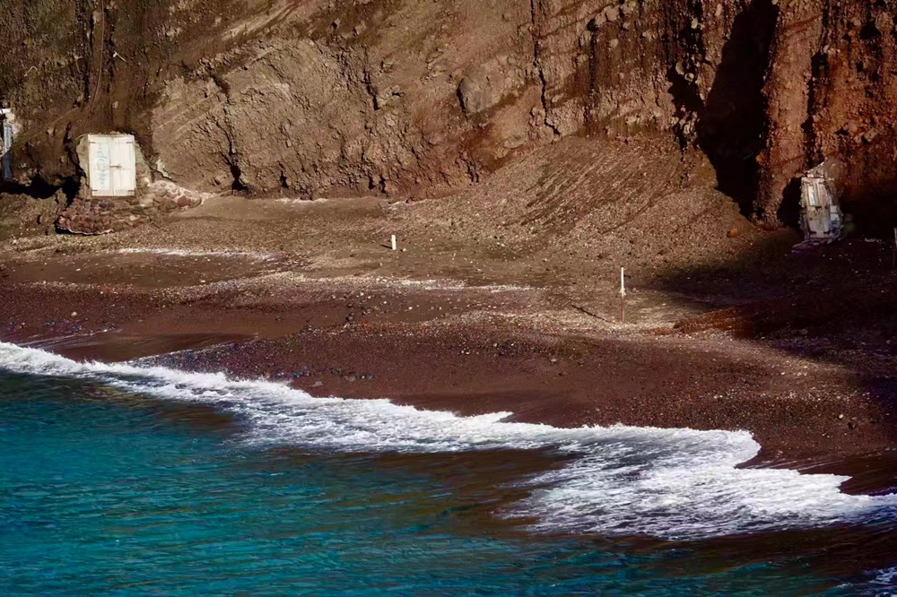 紅沙灘距離阿科羅提利遺址不遠(yuǎn),這里像是神話一般的地方。海水被大片深紅色高聳的山巖所包圍,紅色沙灘十分罕見(jiàn),在陽(yáng)光的照耀下更加顯得耀眼奪目。李仁奇 攝