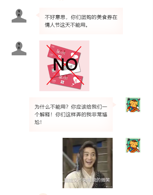遇到春節(jié)、情人節(jié)等特殊時(shí)期,消費(fèi)者在團(tuán)購(gòu)時(shí)應(yīng)當(dāng)看清使用期限,如商家未提前說(shuō)明美食券的限用日期,而是去到現(xiàn)場(chǎng)才告知消費(fèi)者不能使用,則商家涉嫌侵害消費(fèi)者的知情權(quán)、公平交易權(quán)。如商家銷售美食券的頁(yè)面,注明情人節(jié)不能使用,此時(shí)商家盡到了提醒義務(wù),消費(fèi)者可在規(guī)定的其他時(shí)間內(nèi)使用美食券,或者向平臺(tái)申請(qǐng)退款。(消費(fèi)提示:消費(fèi)者購(gòu)買團(tuán)購(gòu)券時(shí),要仔細(xì)閱讀團(tuán)購(gòu)頁(yè)面的使用說(shuō)明,特別是要仔細(xì)瀏覽團(tuán)購(gòu)券使用時(shí)限。限用人數(shù)等具體內(nèi)容,避免遭遇買了卻用不了的困境。)