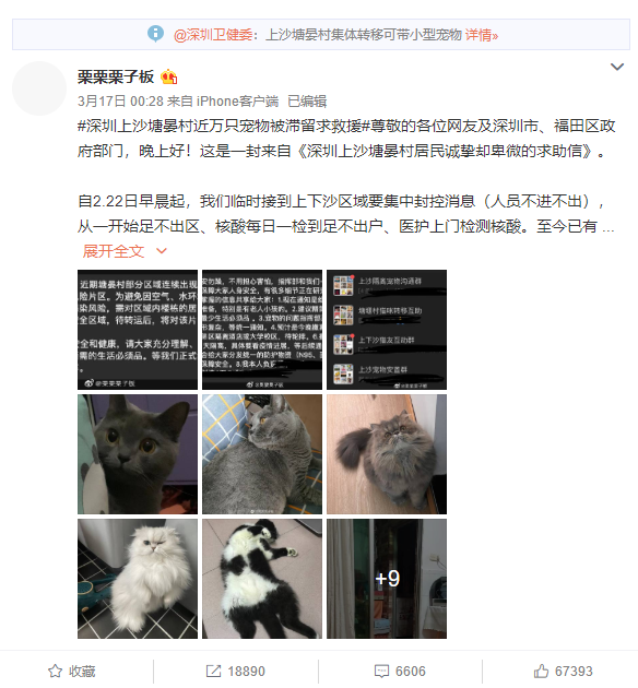 讀特客戶端·深圳新聞網2022年3月18日訊(記者 戰(zhàn)旗 陳蘇雅 劉詩瑾)3月16日,博主“栗栗栗子板”發(fā)布的一條微博沖上微博熱搜,深圳上沙塘晏村轉移的事件也被市民熱議,其中寵物去向的話題更是引發(fā)了人們的關注。