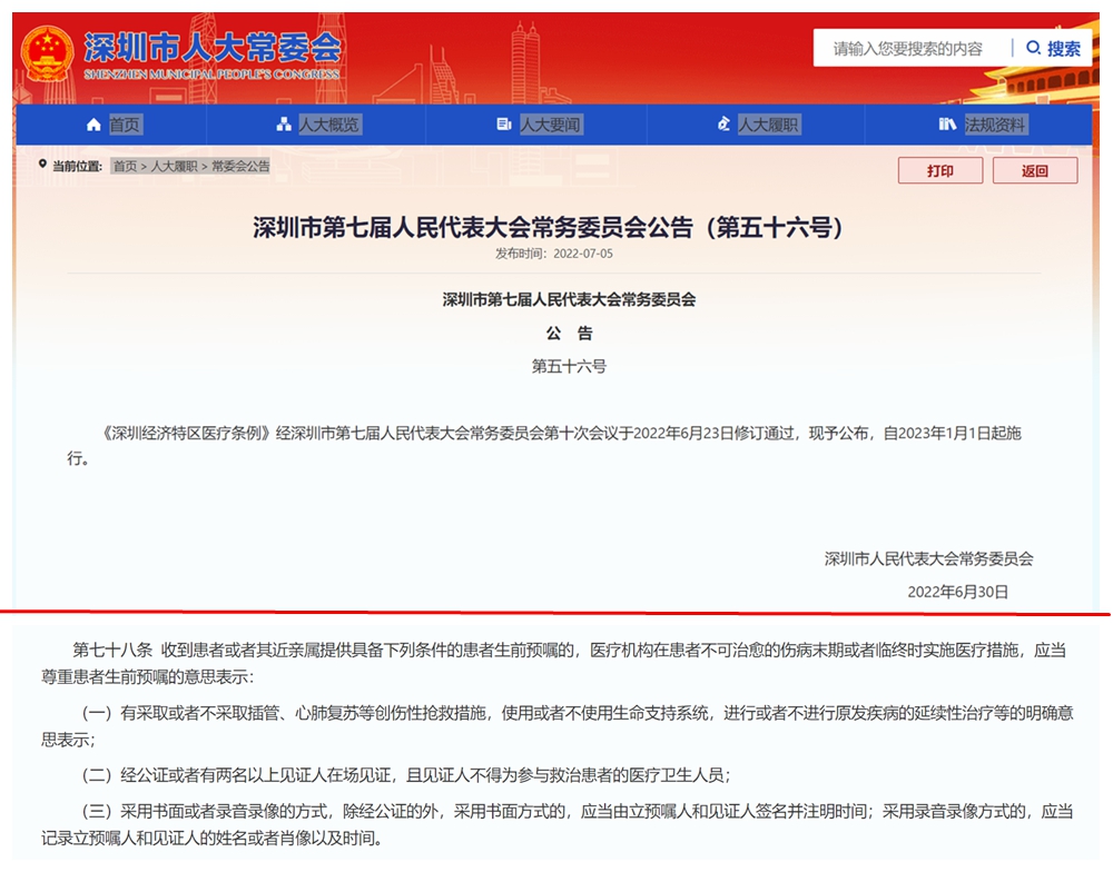 讀特客戶端·深圳新聞網(wǎng)2022年7月8日訊(記者 張玲 翁任瑩)7月5日,北京市盈科(深圳)律師事務(wù)所律師杜芹到深圳公證處,為自己做了一份生前預(yù)囑。這份生前預(yù)囑,有可能成為深圳首份公證的生前預(yù)囑。6月23日,深圳市人大常委會表決通過《深圳經(jīng)濟(jì)特區(qū)醫(yī)療條例》(以下簡稱《條例》),該《條例》將于2023年1月1日起施行。深圳通過立法率先建立的“生前預(yù)囑制度”可謂一石激起千層浪,引發(fā)全國網(wǎng)友和各方持續(xù)關(guān)注。