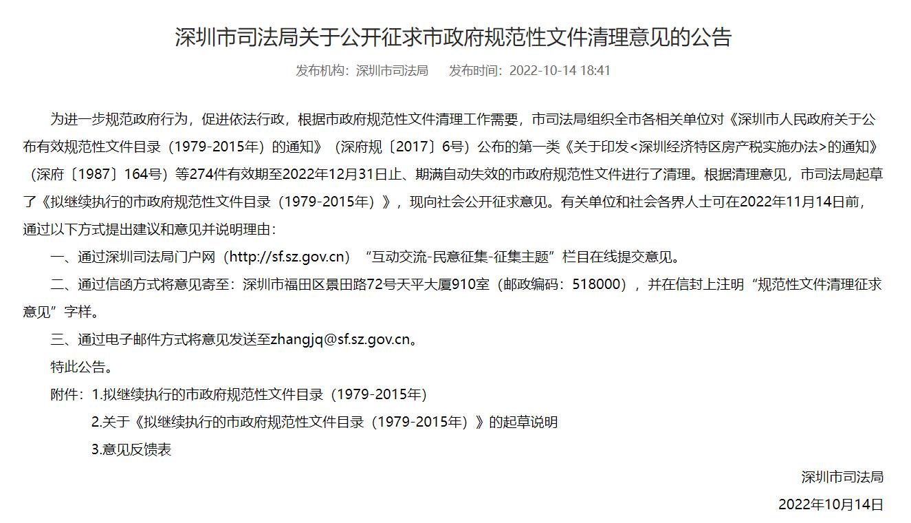 深圳擬清理274件市政府規(guī)范性文件 11月14日前可提交意見