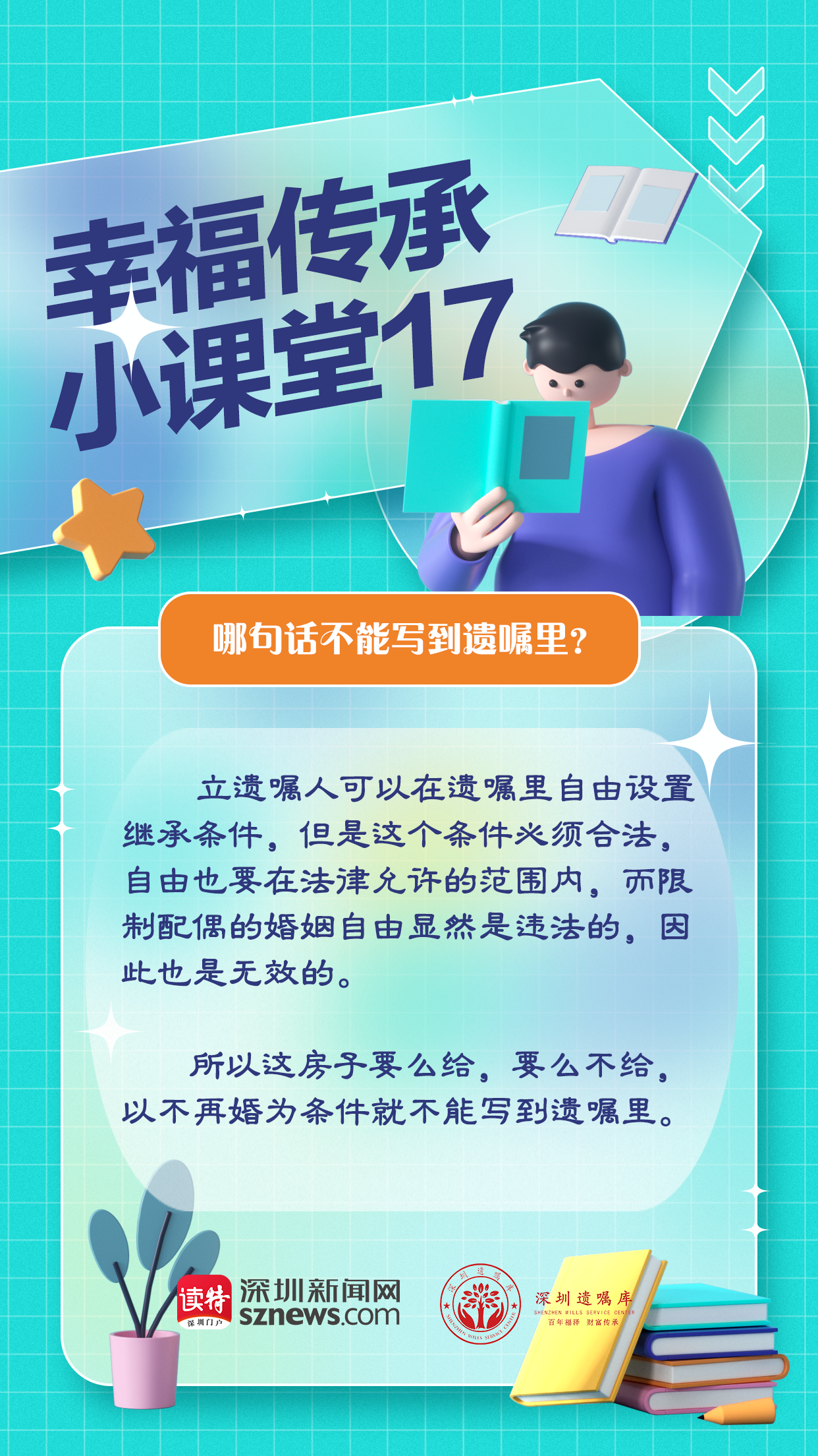 由深圳新聞網(wǎng)聯(lián)合廣東嘉得信律師事務(wù)所、深圳遺囑庫特別策劃的“幸福傳承小課堂”第17期就來說說,哪些話不能寫到遺囑里。上述案例的老兩口考慮很周全,他們把各個(gè)銀行的存款都列了一個(gè)明細(xì)單,標(biāo)明了分配方式,哪一筆給兒子,哪一筆留給女兒,總體來說兒女分到的財(cái)產(chǎn)都差不多。