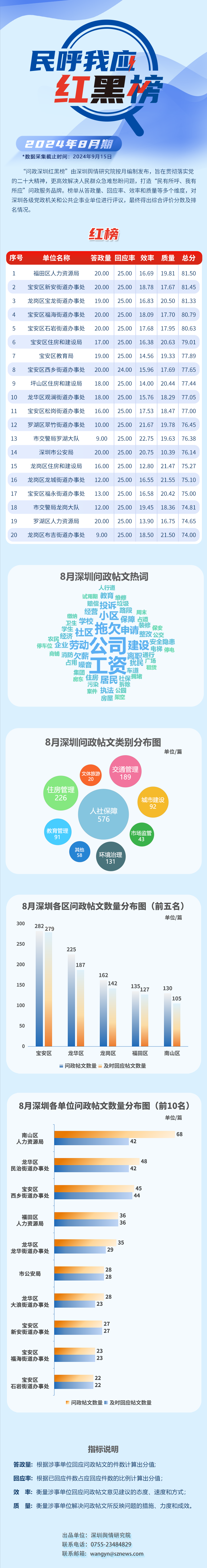 “深圳民呼我應(yīng)紅黑榜”由深圳輿情研究院按月編制發(fā)布,旨在貫徹落實(shí)黨的二十大精神,更高效解決人民群眾急難愁盼問題,打造“民有所呼、我有所應(yīng)”問政服務(wù)品牌。榜單從答政量、回應(yīng)率、效率和質(zhì)量等多個(gè)維度對深圳各級黨政機(jī)關(guān)和公共企事業(yè)單位進(jìn)行評議,最終得出綜合評價(jià)分?jǐn)?shù)及排名情況。