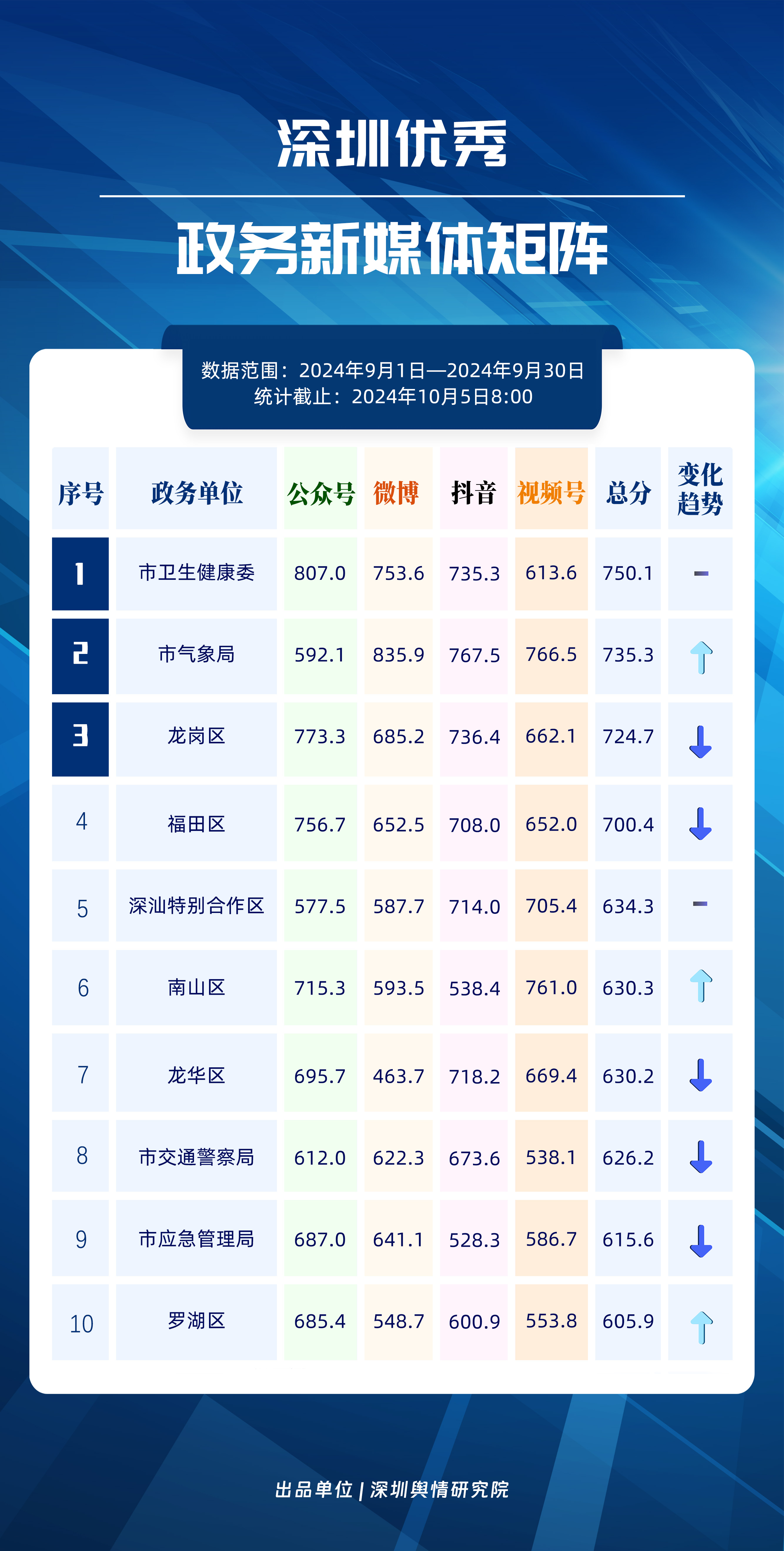 9月,深圳市衛(wèi)生健康委、市氣象局、龍崗區(qū)、福田區(qū)、深汕特別合作區(qū)、南山區(qū)、龍華區(qū)、市交通警察局、市應(yīng)急管理局、羅湖區(qū)榮登“深圳優(yōu)秀政務(wù)新媒體矩陣”榜單。9月,市衛(wèi)生健康委新媒體矩陣穩(wěn)居榜首,市氣象局在抖音、微信視頻號平臺的影響力和傳播力顯著提升,助力其在榜單上位列第二名。位于榜單第三名的是龍崗區(qū)新媒體矩陣,發(fā)布多篇國慶文化活動、音樂會相關(guān)文娛活動宣傳內(nèi)容,獲得較多瀏覽、點贊,吸引市民前往參與。福田區(qū)新媒體矩陣則登上榜單第四名,通過發(fā)布“以舊換新政策”和“暢游福田”等相關(guān)文章,為網(wǎng)民提供實用的信息,提升了新媒體矩陣的傳播力和影響力。此外,9月恰逢2024年全國網(wǎng)絡(luò)安全宣傳周,全市各區(qū)、各單位積極開展網(wǎng)絡(luò)安全宣傳工作,其中市衛(wèi)生健康委與龍華區(qū)合作拍攝網(wǎng)絡(luò)安全主題宣傳短劇,起到幫助市民提高網(wǎng)絡(luò)安全意識的效果,為營造安全的網(wǎng)絡(luò)環(huán)境做出了積極貢獻(xiàn)。