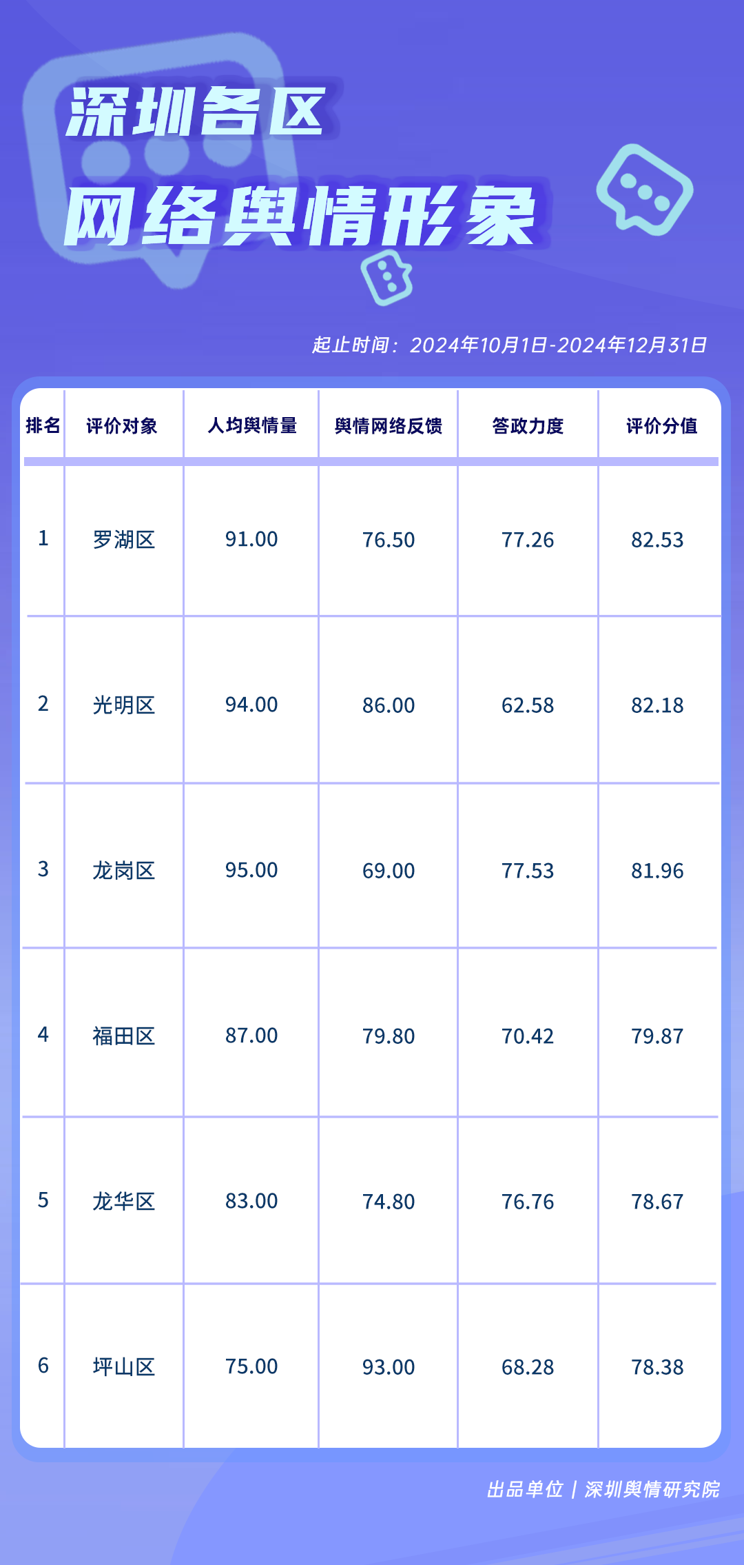 10-12月,福田區(qū)、龍崗區(qū)、光明區(qū)、龍華區(qū)、南山區(qū)、寶安區(qū)登上榜單前六。榜單中,福田區(qū)、龍崗區(qū)、光明區(qū)位列前三,綜合評(píng)價(jià)分值均在80分以上,居于榜單第四至第六名的龍華區(qū)、南山區(qū)、寶安區(qū)也在積極塑造網(wǎng)絡(luò)形象的道路上不斷邁進(jìn),展現(xiàn)了各區(qū)在網(wǎng)絡(luò)形象建設(shè)領(lǐng)域的蓬勃活力與持續(xù)努力。