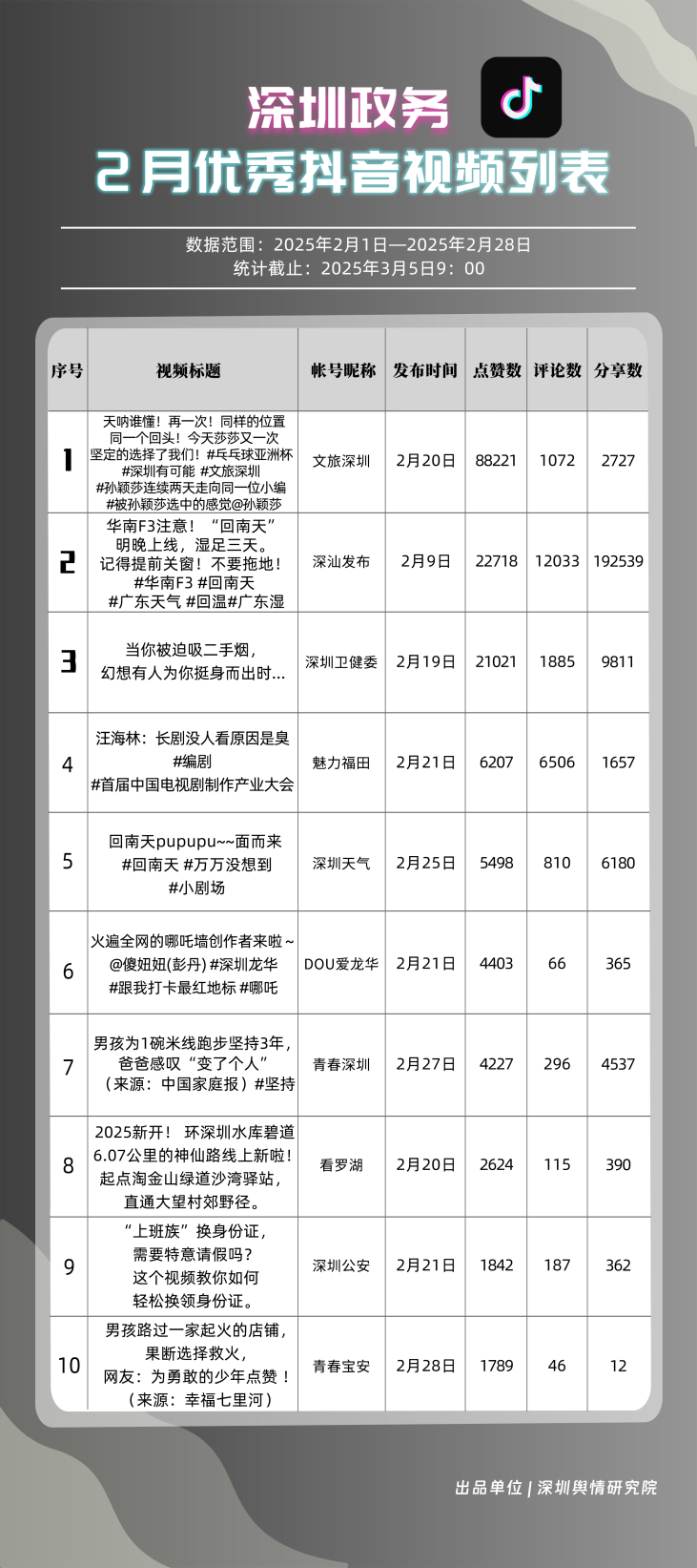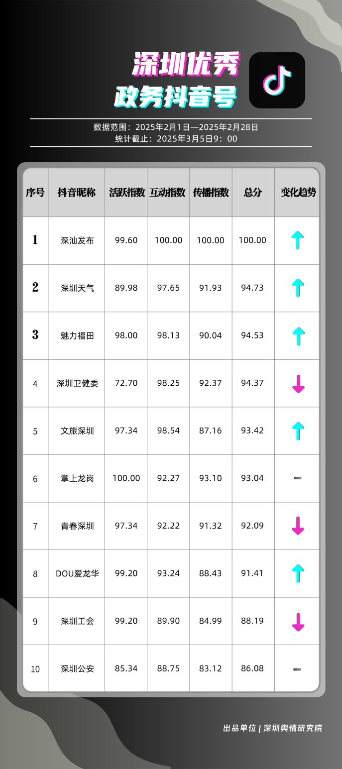 2月,“深汕發(fā)布”“深圳天氣”“魅力福田”“深圳衛(wèi)健委”“文旅深圳”“掌上龍崗”“青春深圳”“DOU愛(ài)龍華”“深圳工會(huì)”“深圳公安”共10個(gè)政務(wù)抖音號(hào)獲得“深圳優(yōu)秀政務(wù)抖音號(hào)”稱號(hào)。“深汕發(fā)布”位于榜單第一名,值得關(guān)注的是,該賬號(hào)2月作品總分享數(shù)超20萬(wàn)次,其中有關(guān)“華南地區(qū)回南天”的視頻單條分享量達(dá)到19萬(wàn)次以上,展現(xiàn)出強(qiáng)勁的傳播力。“深圳天氣”“魅力福田”“深圳衛(wèi)健委”三賬號(hào)堅(jiān)持輸出優(yōu)質(zhì)內(nèi)容,得分均在94分以上,展現(xiàn)出深圳政務(wù)新媒體賬號(hào)在短視頻傳播領(lǐng)域的創(chuàng)新活力。