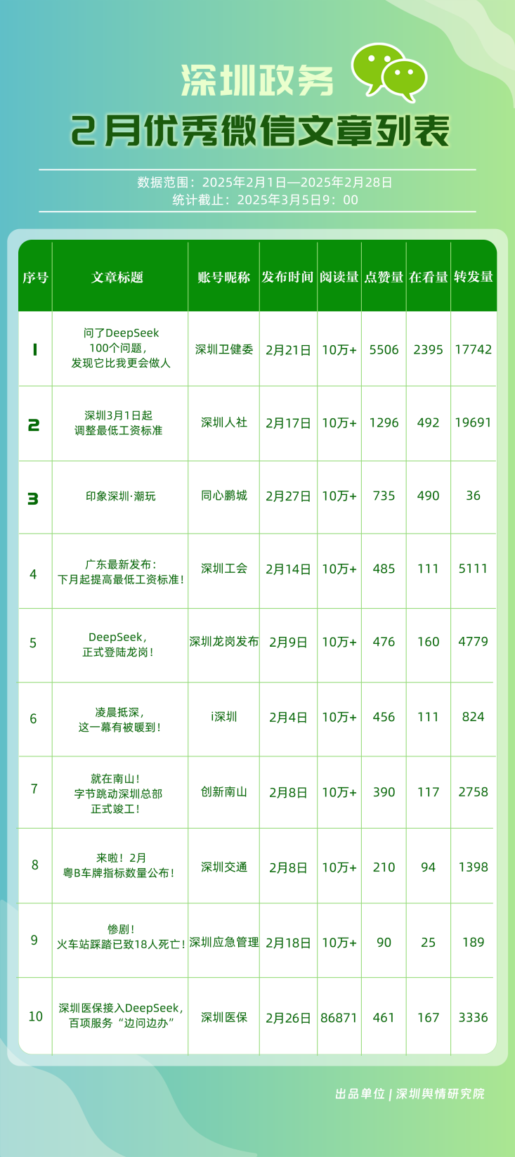 2025年2月期《深圳優(yōu)秀政務(wù)新媒體矩陣》發(fā)布,本期榜單框架有所優(yōu)化,公眾號(hào)、微博號(hào)、抖音號(hào)、視頻號(hào)得分在綜合計(jì)算時(shí)的權(quán)重調(diào)整為30%、20%、30%、20%。公眾號(hào)榜單中,根據(jù)閱讀量超10萬(wàn)次的文章篇數(shù),在傳播指數(shù)額外加分,激勵(lì)優(yōu)質(zhì)內(nèi)容產(chǎn)出。接下來(lái),讓我們一同揭曉,2月哪些矩陣成為政務(wù)信息傳播與服務(wù)創(chuàng)新標(biāo)桿,為政務(wù)新媒體矩陣創(chuàng)新發(fā)展樹(shù)立高質(zhì)量發(fā)展范式。