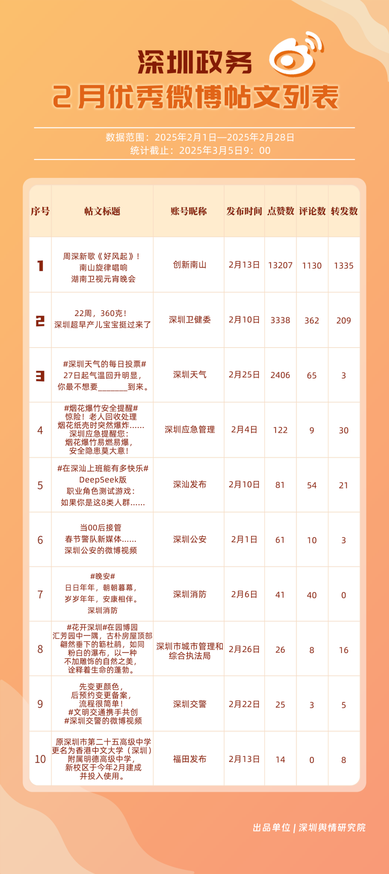 2月,“深圳天氣”“創(chuàng)新南山”“深圳衛(wèi)健委”“深圳消防”“深圳應(yīng)急管理”“福田發(fā)布”“深圳公安”“深汕發(fā)布”“深圳龍崗發(fā)布”“深圳交警”等20個(gè)賬號(hào)入選“優(yōu)秀政務(wù)微博號(hào)”。綜合看來(lái),本月榜單前10名較上期變動(dòng)不大,反映出靠前賬號(hào)運(yùn)營(yíng)發(fā)揮較穩(wěn)定。其中,“深圳天氣”在榜單中獲得第一名,該賬號(hào)與網(wǎng)民互動(dòng)積極,2月作品總點(diǎn)贊數(shù)超8萬(wàn)次;“創(chuàng)新南山”“深圳衛(wèi)健委”“深圳消防”“深圳應(yīng)急管理”也各有所長(zhǎng),排名靠前,展現(xiàn)出深圳政務(wù)微博在形象塑造、民生服務(wù)、應(yīng)急科普等領(lǐng)域的持續(xù)影響力。