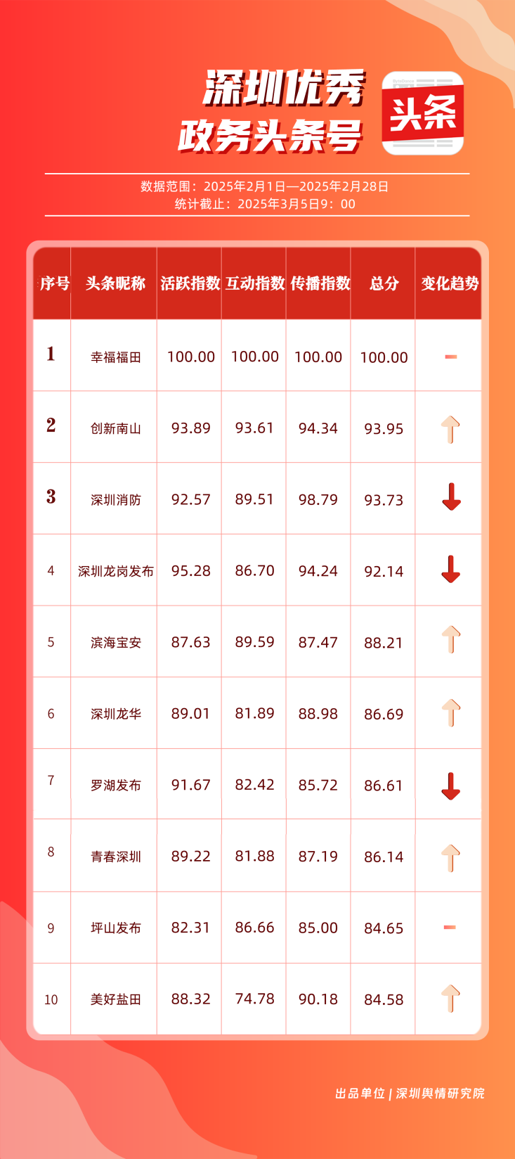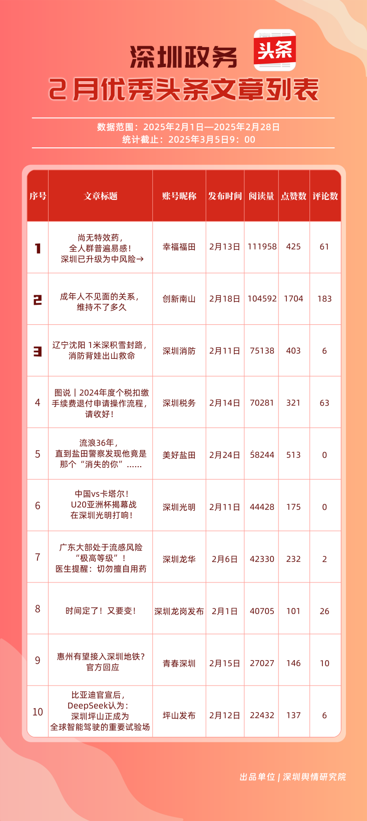 2月,“幸福福田”“創(chuàng)新南山”“深圳消防”“深圳龍崗發(fā)布”“濱海寶安”“深圳龍華”“羅湖發(fā)布”“青春深圳”“坪山發(fā)布”“美好鹽田”共10個(gè)政務(wù)頭條號(hào)入選“優(yōu)秀政務(wù)頭條號(hào)”榜單?!靶腋8L铩?月今日頭條作品總閱讀數(shù)超60萬(wàn),綜合實(shí)力較強(qiáng),多次位居頭條平臺(tái)榜單第一?!皠?chuàng)新南山”“深圳消防”“深圳龍崗發(fā)布”總分均在90分以上,展現(xiàn)出深圳政務(wù)頭條號(hào)的持續(xù)影響力,為其他政務(wù)賬號(hào)提供了可借鑒的運(yùn)營(yíng)范例。