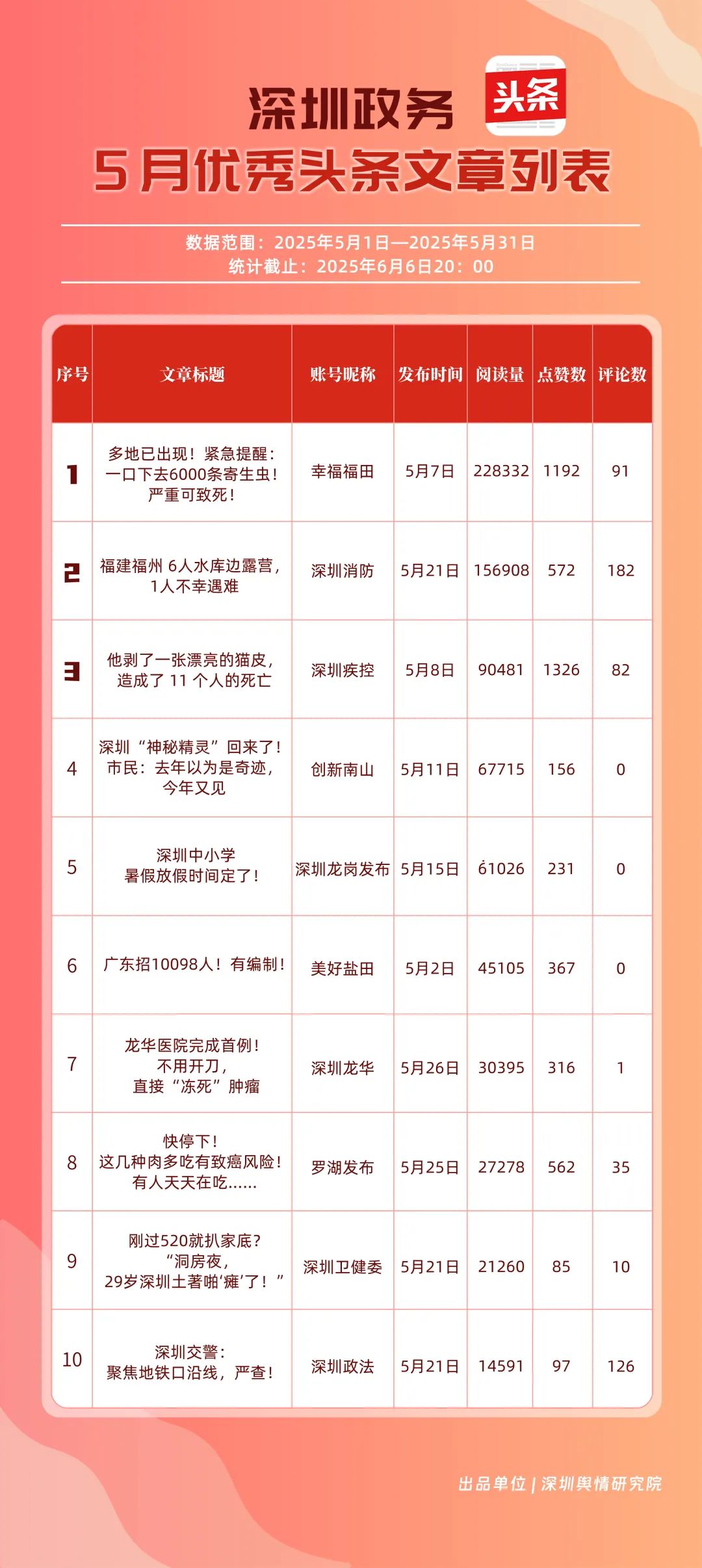 5月,“幸福福田”“深圳消防”“創(chuàng)新南山”“深圳疾控”“羅湖發(fā)布”“深圳龍崗發(fā)布”“坪山發(fā)布”“青春深圳”“深圳龍華”“深圳人社”共10個(gè)政務(wù)頭條號(hào)入選“優(yōu)秀政務(wù)頭條號(hào)”榜單。在榜單前三名中,“幸福福田”“創(chuàng)新南山”以穩(wěn)定且高質(zhì)量的內(nèi)容輸出,持續(xù)領(lǐng)跑,排名較上個(gè)月未發(fā)生變動(dòng)。位居榜單第二的“深圳消防”同樣表現(xiàn)亮眼,排名較上個(gè)月提升2個(gè)名次,充分展現(xiàn)了其在消防安全宣傳領(lǐng)域的持續(xù)深耕和創(chuàng)新突破。上榜政務(wù)頭條號(hào)各展所長(zhǎng),以?xún)?yōu)質(zhì)內(nèi)容為核心,充分發(fā)揮平臺(tái)傳播優(yōu)勢(shì),為政務(wù)信息的高效觸達(dá)與廣泛傳播樹(shù)立了標(biāo)桿。
