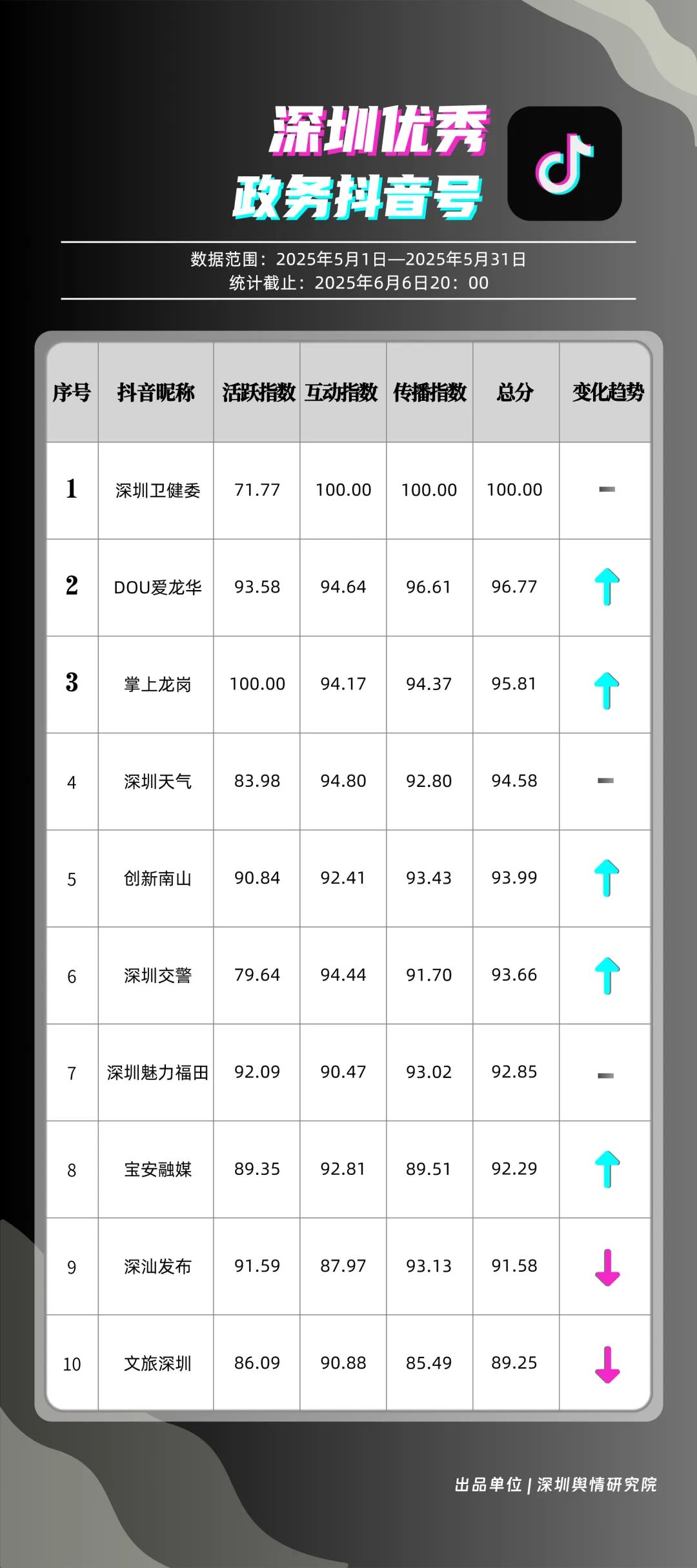 5月,“深圳衛(wèi)健委”“DOU愛(ài)龍華”“掌上龍崗”“深圳天氣”“創(chuàng)新南山”“深圳交警”“深圳魅力福田”“寶安融媒”“深汕發(fā)布”“文旅深圳”共10個(gè)政務(wù)抖音號(hào)獲得“優(yōu)秀政務(wù)抖音號(hào)”稱(chēng)號(hào)。5月,“深圳衛(wèi)健委”憑借3條極具創(chuàng)意的視頻內(nèi)容持續(xù)收獲網(wǎng)民關(guān)注,穩(wěn)居榜首之位,成為政務(wù)抖音號(hào)領(lǐng)域的標(biāo)桿?!癉OU愛(ài)龍華”“掌上龍崗”較上個(gè)月排名大幅度上升,以96.77分和95.81分位居榜單第2、3名,彰顯出積極探索創(chuàng)新傳播路徑、開(kāi)拓政務(wù)短視頻發(fā)展新可能的決心。以上優(yōu)秀政務(wù)抖音號(hào)通過(guò)多樣化的短視頻形式傳遞政務(wù)資訊,為深圳政務(wù)新媒體在短視頻領(lǐng)域的蓬勃發(fā)展注入強(qiáng)勁動(dòng)能,成為政務(wù)信息傳播的新標(biāo)桿。