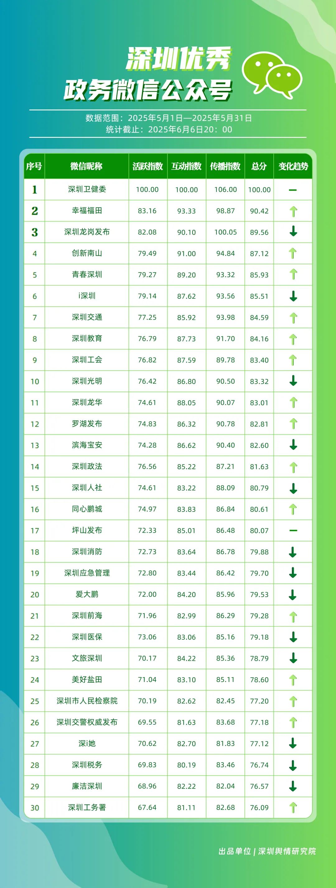 5月,30個(gè)政務(wù)微信公眾號(hào)入選“深圳優(yōu)秀政務(wù)微信公眾號(hào)”榜單,其中包括“深圳衛(wèi)健委”“幸福福田”“深圳龍崗發(fā)布”“創(chuàng)新南山”“青春深圳”“i深圳”“深圳交通”“深圳教育”“深圳工會(huì)”“深圳光明”等。其中,“深圳衛(wèi)健委”在活躍、互動(dòng)、傳播3項(xiàng)指標(biāo)上獲得滿(mǎn)分,其亮眼數(shù)據(jù)彰顯了內(nèi)容創(chuàng)作的高質(zhì)量,位居榜單首位?!靶腋8L铩蓖瑯颖憩F(xiàn)出色,排名較上個(gè)月有所上升,以總分90.42的優(yōu)異成績(jī)位居榜單第2名;“深圳龍崗發(fā)布”“創(chuàng)新南山”“青春深圳”緊隨其后,以新穎的互動(dòng)形式吸引用戶(hù)參與,表現(xiàn)值得肯定。上榜賬號(hào)充分發(fā)揮微信公眾平臺(tái)的傳播優(yōu)勢(shì),以豐富多元的內(nèi)容形態(tài)、生動(dòng)鮮活的表達(dá)風(fēng)格,持續(xù)為市民提供優(yōu)質(zhì)的信息服務(wù)。