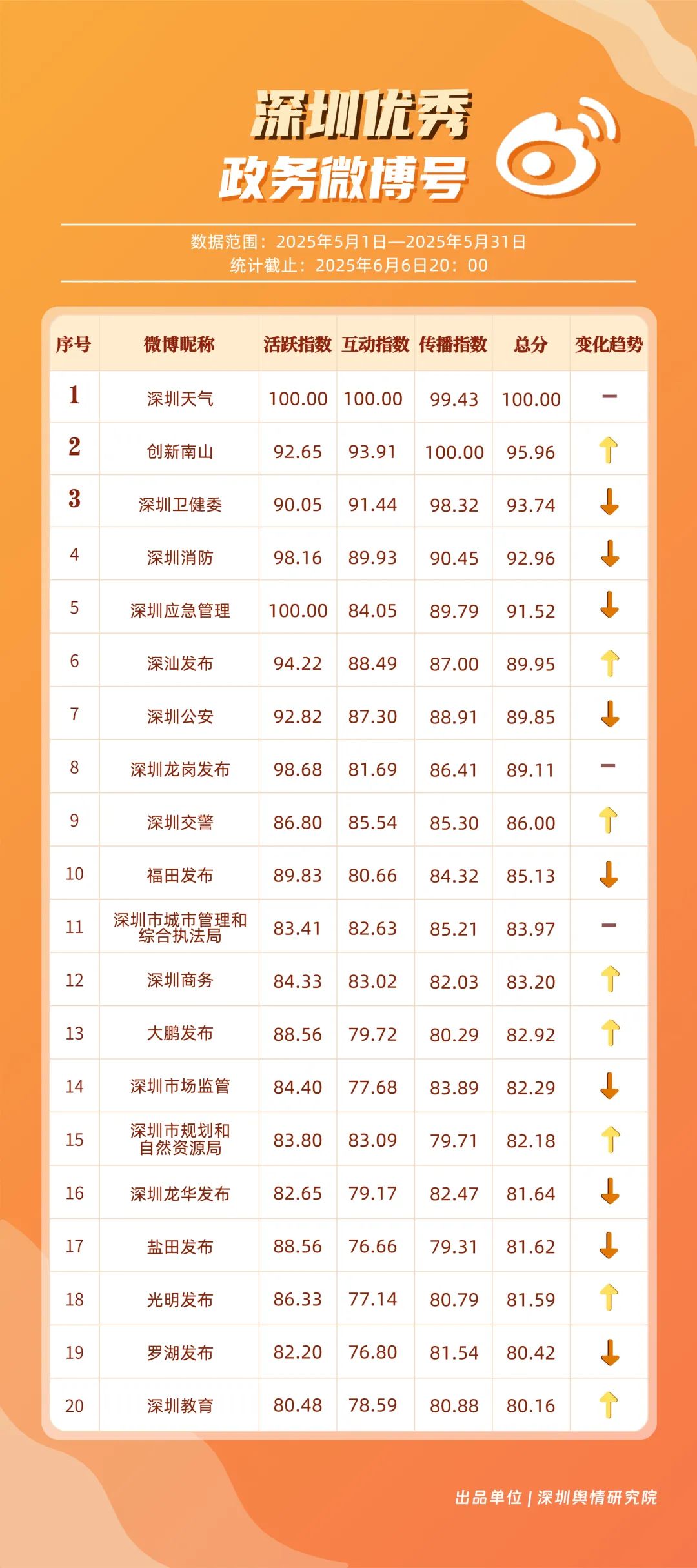 5月,“深圳天氣”“創(chuàng)新南山”“深圳衛(wèi)健委”“深圳消防”“深圳應(yīng)急管理”“深汕發(fā)布”“深圳公安”“深圳龍崗發(fā)布”“深圳交警”“福田發(fā)布”等20個(gè)賬號(hào)入選“優(yōu)秀政務(wù)微博號(hào)”。其中,“深圳天氣”憑借活躍指數(shù)和互動(dòng)指數(shù)雙項(xiàng)滿(mǎn)分的亮眼成績(jī),穩(wěn)居榜單首位?!皠?chuàng)新南山”以95.96分緊隨其后,在互動(dòng)、傳播指數(shù)得分大幅提升,排名實(shí)現(xiàn)顯著躍升?!吧钲谛l(wèi)健委”“深圳消防”“深圳應(yīng)急管理”也表現(xiàn)卓越,總分均超過(guò)90分,它們憑借權(quán)威信息發(fā)布、專(zhuān)業(yè)知識(shí)科普,展現(xiàn)了各單位在民生服務(wù)、公共安全領(lǐng)域的重要作用。以上優(yōu)秀政務(wù)微博號(hào)深度契合平臺(tái)的傳播特征,善于借助熱門(mén)話(huà)題擴(kuò)大影響力,以鮮明的賬號(hào)特色展現(xiàn)區(qū)域風(fēng)采。