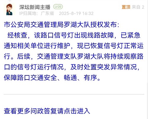 經(jīng)核查,該路口信號燈出現(xiàn)線路故障,已緊急通知相關(guān)單位進(jìn)行維護(hù),現(xiàn)已恢復(fù)信號燈正常運(yùn)行。后續(xù),交通管理支隊(duì)羅湖大隊(duì)將持續(xù)觀察路口的信號燈運(yùn)行情況,及時處置突發(fā)異常情況,保障路口交通安全、暢通、有序。