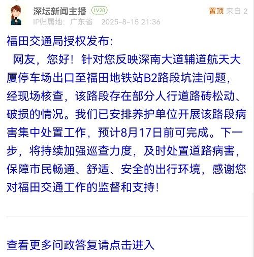 網(wǎng)友,您好!針對您反映深南大道輔道航天大廈停車場出口至福田地鐵站B2路段坑洼問題,經(jīng)現(xiàn)場核查,該路段存在部分人行道路磚松動、破損的情況。我們已安排養(yǎng)護(hù)單位開展該路段病害集中處置工作,預(yù)計8月17日前可完成。下一步,將持續(xù)加強(qiáng)巡查力度,及時處置道路病害,保障市民暢通、舒適、安全的出行環(huán)境,感謝您對福田交通工作的監(jiān)督和支持!