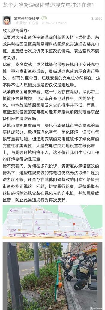 4. 帖文《龍華大浪街道綠化帶違規(guī)充電樁還在裝?》