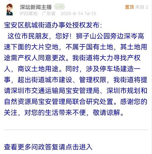 這位市民朋友,您好!獅子山公園旁邊深岑高速下面的大片空地,不屬于國有土地,其土地用途需產(chǎn)權(quán)人同意更改。我街道將大力尋找產(chǎn)權(quán)人,商議土地用途。同時,涉及停車場建造一事,超出街道城市建設(shè)、管理權(quán)限,我街道將提請深圳市交通運(yùn)輸局寶安管理局、深圳市規(guī)劃和自然資源局寶安管理局聯(lián)合研究處置。感謝您的關(guān)注,對您的生活帶來不便,敬請諒解。