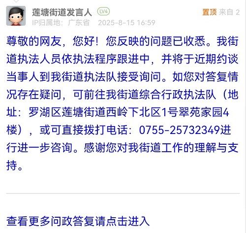 尊敬的網(wǎng)友,您好!您反映的問題已收悉。我街道執(zhí)法人員依執(zhí)法程序跟進(jìn)中,并將于近期約談當(dāng)事人到我街道執(zhí)法隊(duì)接受詢問。如您對答復(fù)情況存在疑問,可前往我街道綜合行政執(zhí)法隊(duì)(地址:羅湖區(qū)蓮塘街道西嶺下北區(qū)1號翠苑家園4樓),或可直接撥打電話:0755-25732349進(jìn)行進(jìn)一步咨詢。感謝您對我街道工作的理解與支持。