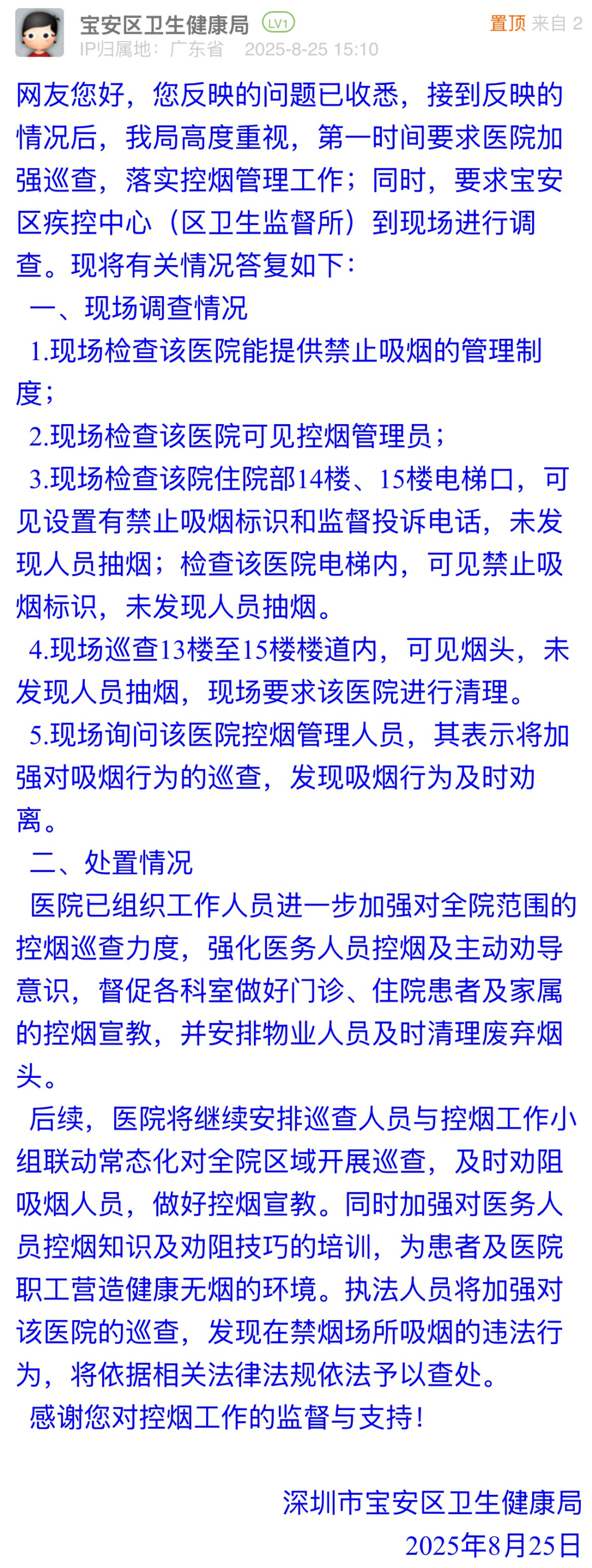 優(yōu)化建議:接到市民反饋后,寶安區(qū)衛(wèi)生健康局快速組織現(xiàn)場調(diào)查,核實(shí)醫(yī)院有禁煙制度、控?zé)煿芾韱T在崗,基礎(chǔ)控?zé)煷胧┖瞬榈轿?,值得點(diǎn)贊。但回應(yīng)中多次強(qiáng)調(diào)“未發(fā)現(xiàn)人員抽煙”,回避對歷史吸煙行為處置、煙頭來源及勸阻機(jī)制失效的解釋,與市民關(guān)切脫節(jié),難以消除市民對醫(yī)院日常控?zé)熌芰Φ膿?dān)憂,建議完善具體控?zé)煷胧缂友b煙感報(bào)警裝置,建立核查公示制度等,筑牢“無煙醫(yī)院”防線。