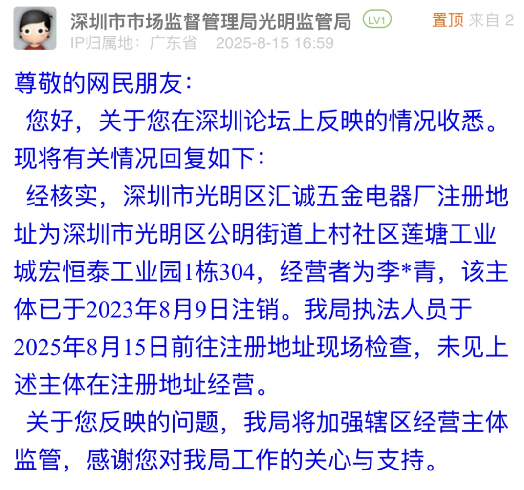 優(yōu)化建議:深圳市市場監(jiān)督管理局光明管理局的回應(yīng)中,核實(shí)了涉事電器廠已注銷,且不在注冊地經(jīng)營,也提及加強(qiáng)轄區(qū)主體監(jiān)管,但市民反映的排插套用注銷主體信息銷售、違規(guī)標(biāo)識3C標(biāo)志等關(guān)鍵問題,未得到明確解答。若回應(yīng)中能豐富指引類內(nèi)容,如告知市民可向平臺追責(zé)的途徑、提交證據(jù)的具體方式,為市民維權(quán)提供清晰方向,將更貼合市民需求,也能讓回應(yīng)更具實(shí)際意義。