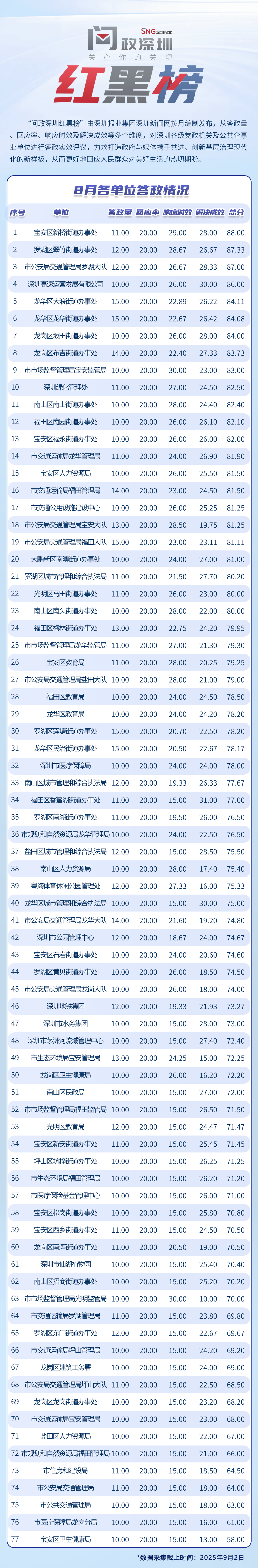 為探尋媒體如何精準(zhǔn)賦能基層治理現(xiàn)代化的“深圳路徑”,深圳報(bào)業(yè)集團(tuán)正式掛牌成立“問政深圳”工作室,旨在進(jìn)一步推動(dòng)網(wǎng)絡(luò)問政工作的高效開展。為確保相關(guān)工作更加契合實(shí)際需求,自上期起,深圳報(bào)業(yè)集團(tuán)深圳新聞網(wǎng)按照“最快速度辦結(jié)”的總體要求,將原有月度榜單創(chuàng)新升級為“問政深圳紅黑榜”,并對評分體系進(jìn)行了細(xì)致優(yōu)化。該榜單從答政量、回應(yīng)率、響應(yīng)時(shí)效及解決成效等多個(gè)維度,對深圳各級黨政機(jī)關(guān)及公共企事業(yè)單位進(jìn)行答政實(shí)效評議,力求打造政府與媒體攜手共進(jìn)、創(chuàng)新基層治理現(xiàn)代化的新樣板,從而更好地回應(yīng)人民群眾對美好生活的熱切期盼。