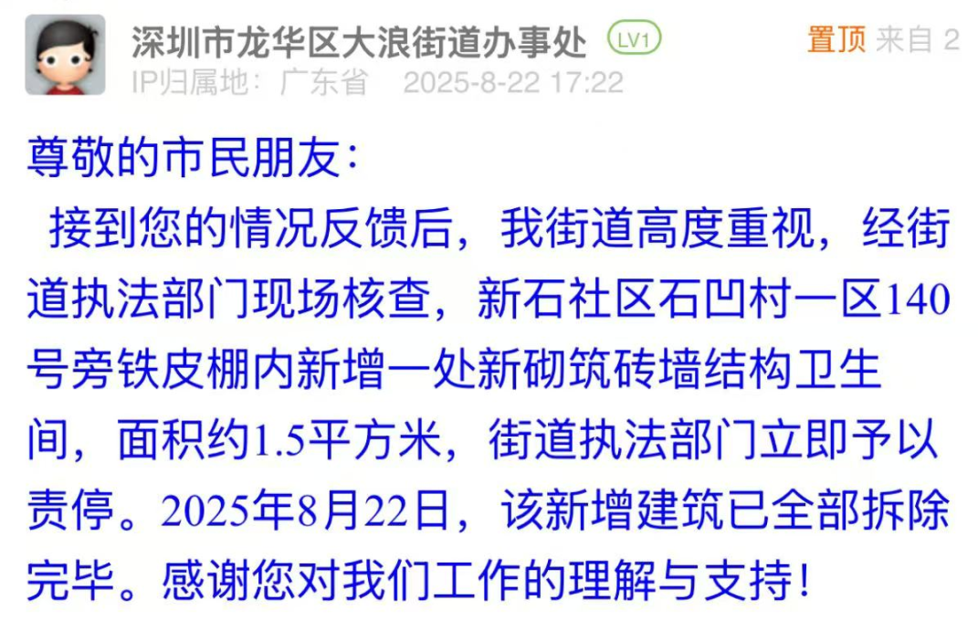 案例點(diǎn)評:8月21日晚間,市民發(fā)布帖文反映違建問題,大浪街道以“雷霆處置”展現(xiàn)安全至上的治理擔(dān)當(dāng)。接到投訴后,街道迅速核查,在22日給出回應(yīng),表示已完成拆除工作,做到了“速辦速結(jié),質(zhì)效雙優(yōu)”。此次響應(yīng)既體現(xiàn)“隱患即事故”的底線思維,更以“發(fā)現(xiàn)即拆除”的高效行動(dòng),彰顯基層治理對民生安全的敏銳感知與果斷處置能力,切實(shí)筑牢居民“身邊安全”防線。