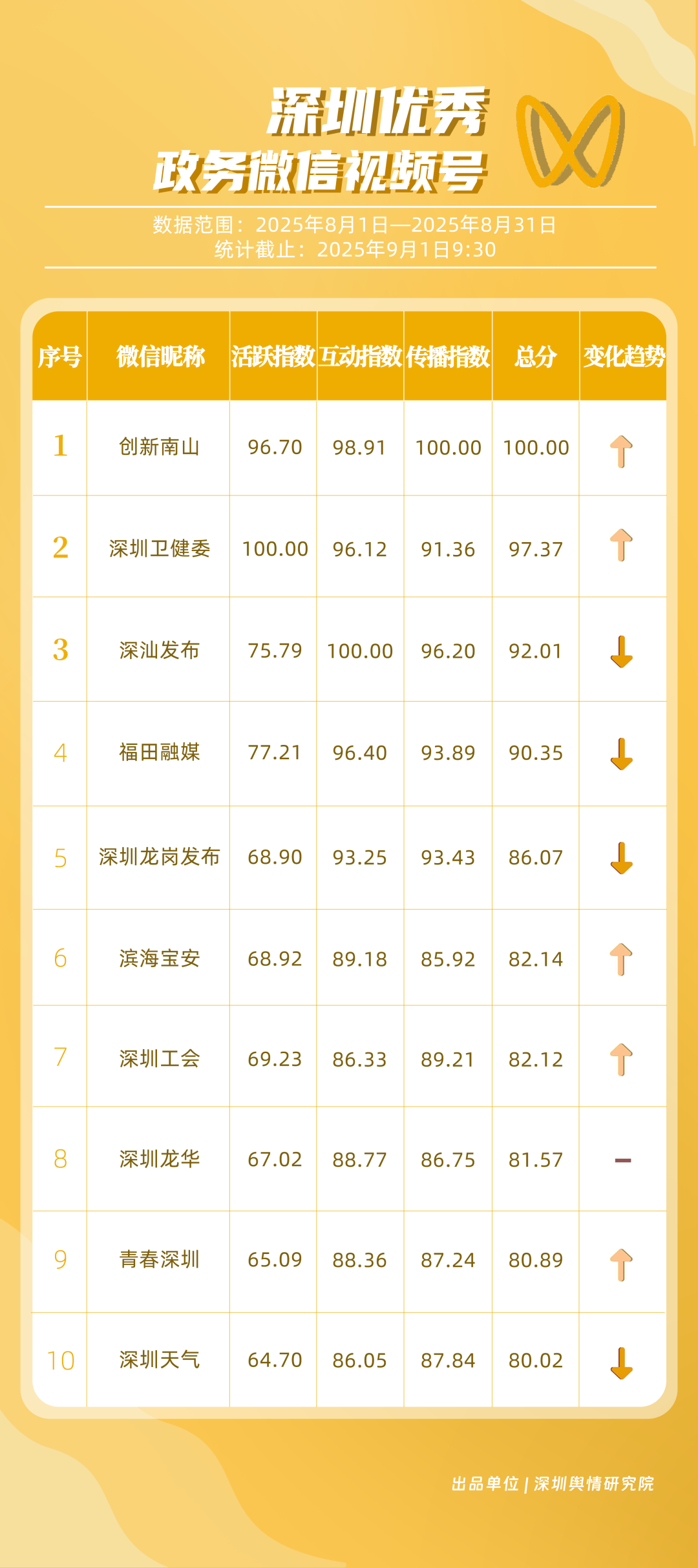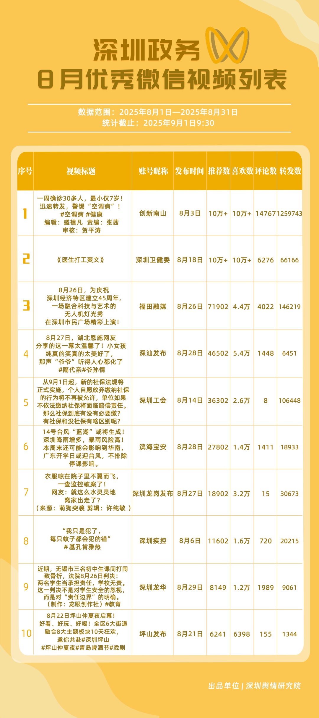 8月,“深圳衛(wèi)健委”“深汕發(fā)布”“深圳魅力福田”“深圳天氣”“掌上龍崗”“DOU愛龍華”“創(chuàng)新南山”“深圳普法”“文旅深圳”“美好鹽田”共10個(gè)政務(wù)抖音號獲得“優(yōu)秀政務(wù)抖音號”稱號?!吧钲谛l(wèi)健委”內(nèi)容吸引大量網(wǎng)民關(guān)注,4條視頻累計(jì)獲得超50萬次點(diǎn)贊,排名從上期的第九名上升至第一名;“深汕發(fā)布”憑借較高的傳播指數(shù)評分,位列第二名,排名有所上升?!吧钲邝攘ΩL铩薄吧钲谔鞖狻钡荣~號緊隨其后,得分均在95分左右。上榜的優(yōu)秀政務(wù)抖音號深耕優(yōu)質(zhì)創(chuàng)作,精準(zhǔn)把握網(wǎng)民興趣點(diǎn),使作品收獲高點(diǎn)贊、高轉(zhuǎn)發(fā),推動評論區(qū)形成良性互動氛圍,以優(yōu)秀內(nèi)容提升政務(wù)傳播效能。