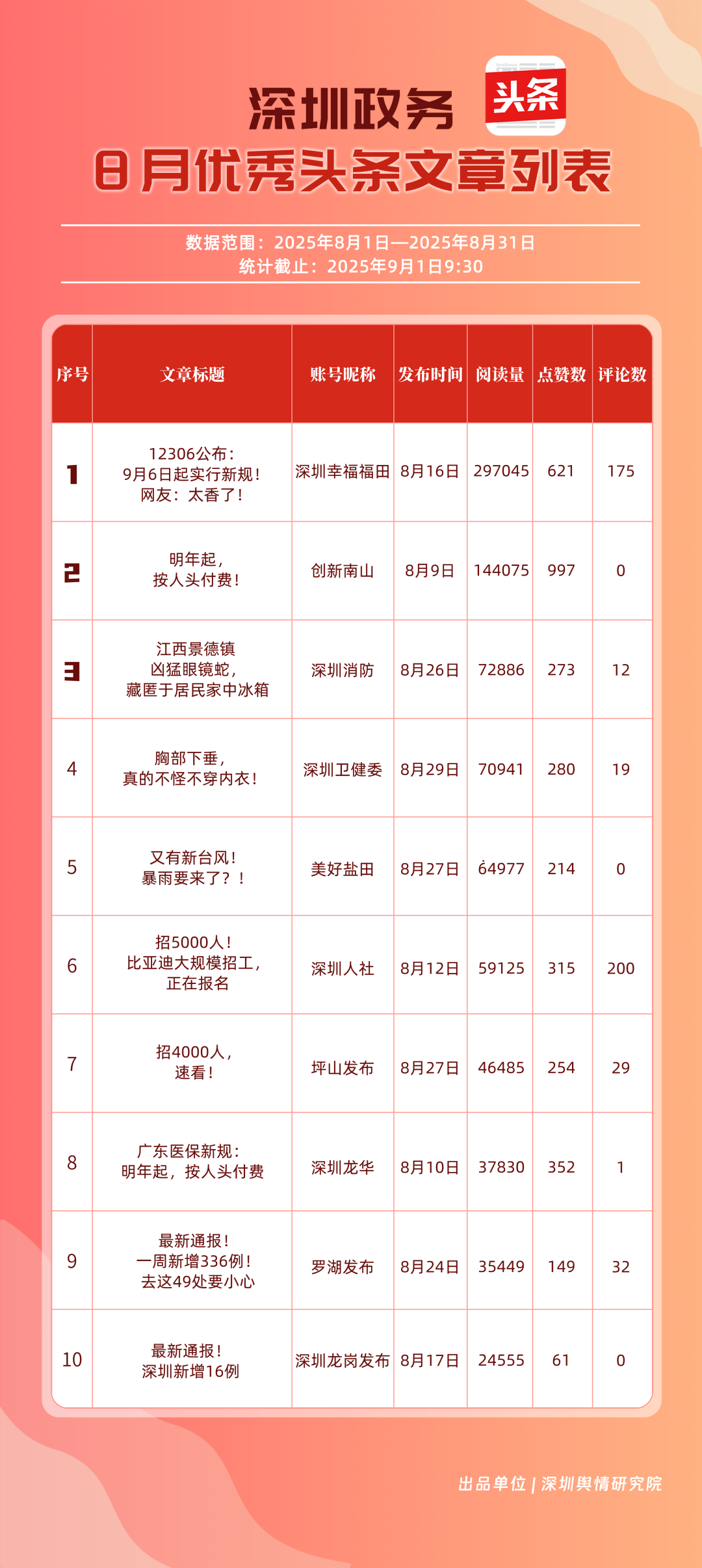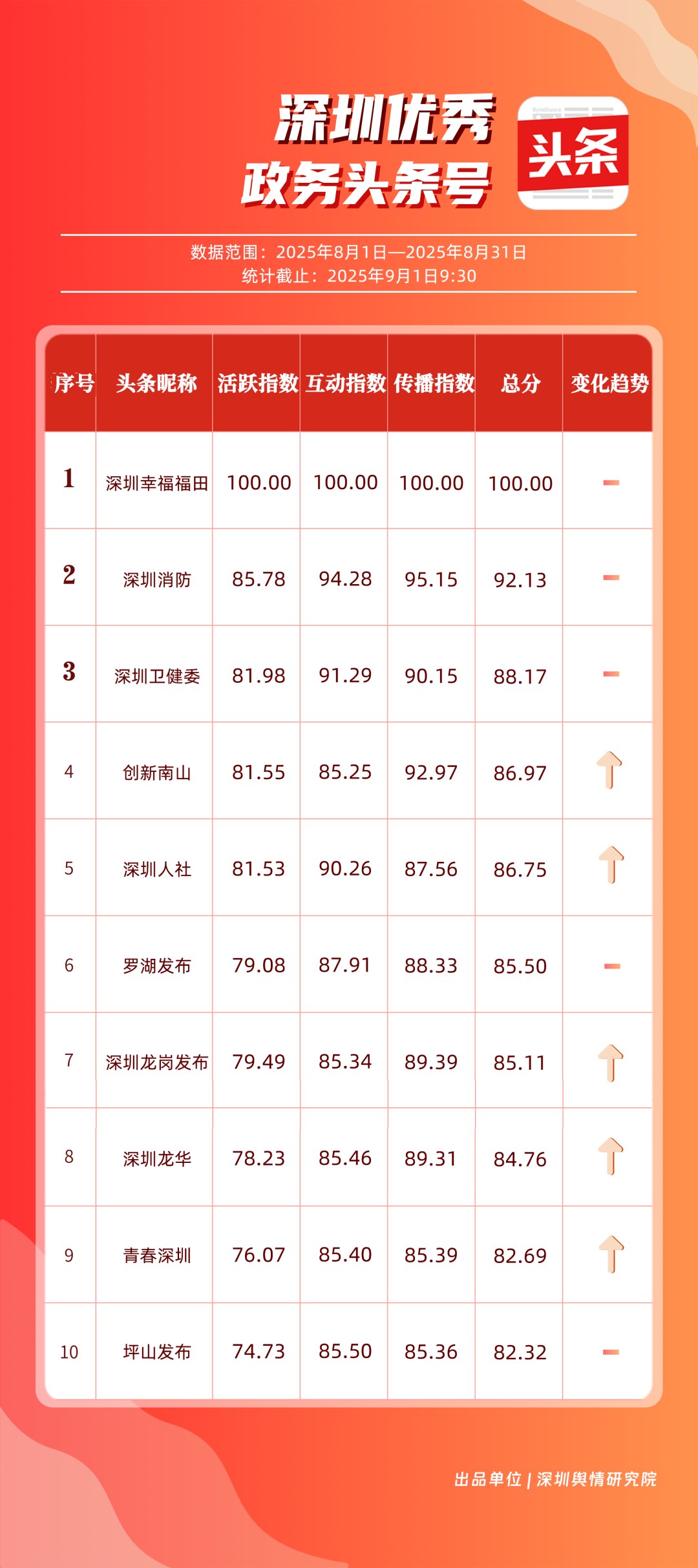 8月,“深圳幸福福田”“深圳消防”“深圳衛(wèi)健委”“創(chuàng)新南山”“深圳人社”“羅湖發(fā)布”“深圳龍崗發(fā)布”“深圳龍華”“青春深圳”“坪山發(fā)布”共10個(gè)政務(wù)頭條號入選“優(yōu)秀政務(wù)頭條號”榜單?!吧钲谛腋8L铩睉{借持續(xù)優(yōu)異的綜合表現(xiàn),以滿分成績穩(wěn)居榜單首位,彰顯出強(qiáng)大的政務(wù)傳播力與影響力;“深圳消防”“深圳衛(wèi)健委”則以穩(wěn)定的內(nèi)容質(zhì)量與深厚的民眾基礎(chǔ),持續(xù)為市民提供權(quán)威、及時(shí)的服務(wù)信息,排名穩(wěn)固?!皠?chuàng)新南山”“深圳人社”等上榜賬號亦表現(xiàn)亮眼,聚焦民生服務(wù)傳遞政策溫度,共同構(gòu)成政務(wù)新媒體矩陣的中堅(jiān)力量,為城市治理與民生服務(wù)注入鮮活動能。