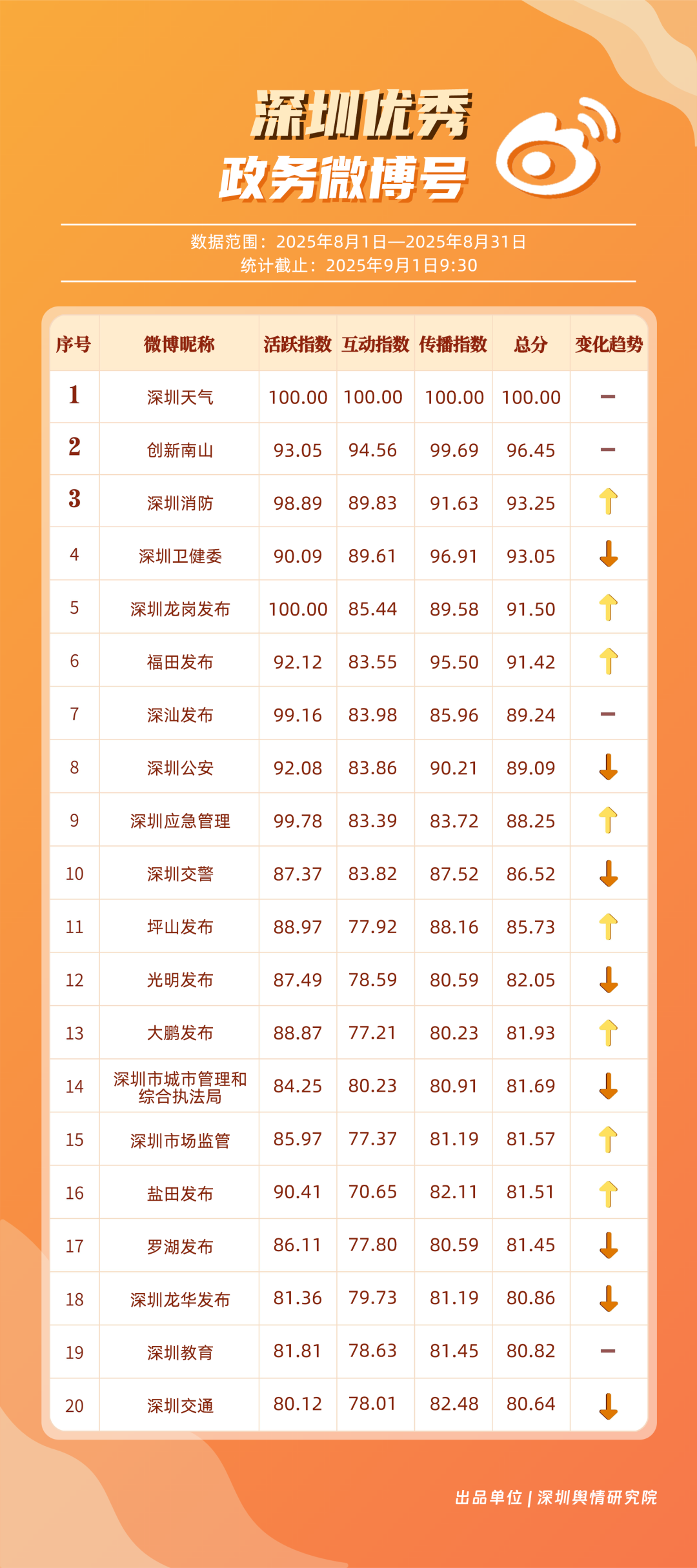 8月,“深圳天氣”“創(chuàng)新南山”“深圳消防”“深圳衛(wèi)健委”“深圳龍崗發(fā)布”“福田發(fā)布”“深汕發(fā)布”“深圳公安”“深圳應(yīng)急管理”“深圳交警”等20個(gè)賬號入選“優(yōu)秀政務(wù)微博號”。其中,“深圳天氣”持續(xù)以優(yōu)質(zhì)內(nèi)容受到網(wǎng)民肯定,蟬聯(lián)榜首;“創(chuàng)新南山”傳播指數(shù)得分再提升,總分96.45,排名保持在第二位;“深圳消防”積極發(fā)布消防相關(guān)內(nèi)容,以93.25分位列第三。上榜優(yōu)秀政務(wù)微博賬號精準(zhǔn)把握網(wǎng)民興趣點(diǎn),內(nèi)容獨(dú)具風(fēng)采,收獲網(wǎng)民認(rèn)可,實(shí)現(xiàn)了較好的傳播效果。