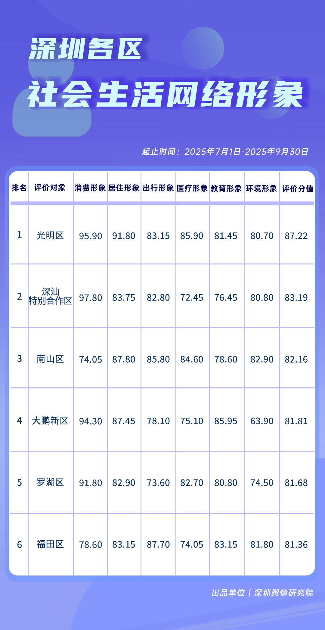 4. 深圳各區(qū)社會生活網絡形象榜:以消費形象、居住形象、出行形象、醫(yī)療形象、教育形象、環(huán)境形象為評價指標,綜合測算各區(qū)消費、居住、出行、醫(yī)療、教育、環(huán)境六大板塊在網絡平臺的提及數和正負面信息數量等多項數據,最終根據不同的權重占比,計算得出評價分值。其中,消費、居住形象的權重占比均為20%;出行、醫(yī)療、教育及環(huán)境形象的權重占比均為15%。
