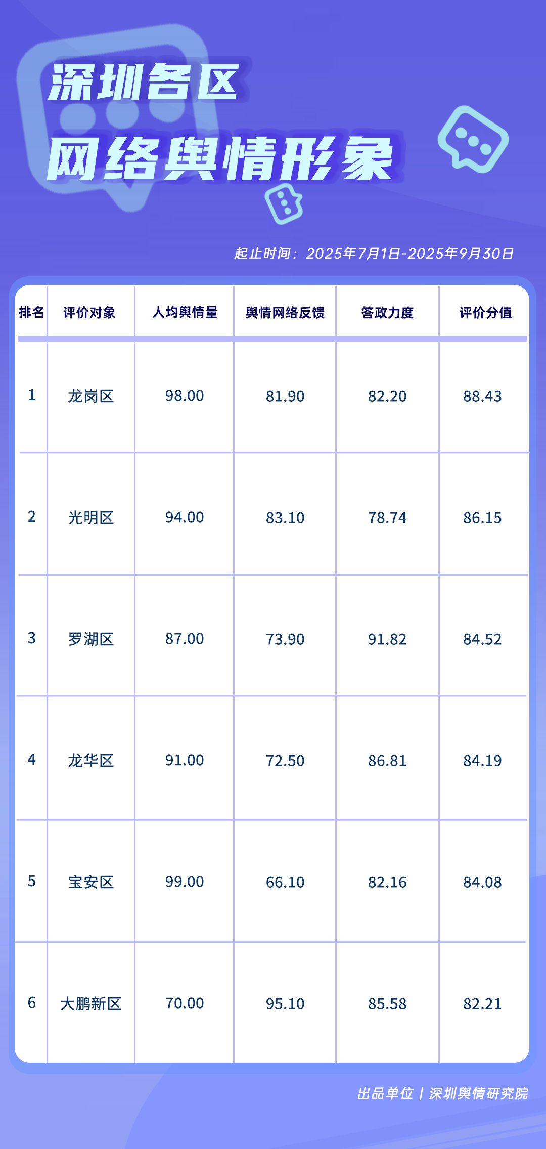 7-9月,在網絡輿情方面,龍崗區(qū)、光明區(qū)得分在86分以上,位居榜單前二,人均輿情量得分較高。羅湖區(qū)、龍華區(qū)、寶安區(qū)、大鵬新區(qū)在輿情治理方面也各有亮點,充分體現(xiàn)了各區(qū)在維護清朗網絡空間、高效回應公眾關切方面的積極作為與責任擔當。