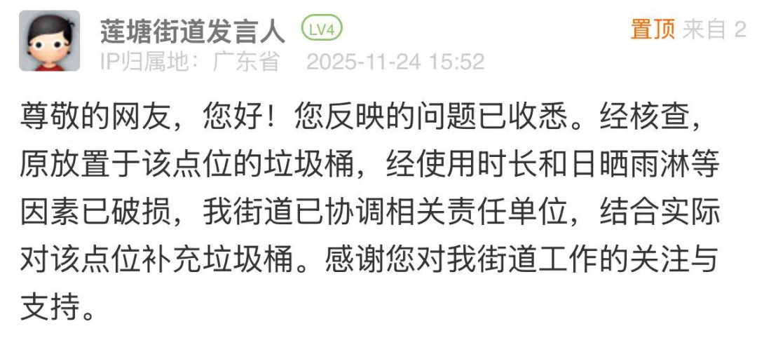 案例點(diǎn)評:針對市民反映“垃圾桶無故取消”的問題,街道辦在3小時(shí)內(nèi)完成核查,清晰說明垃圾桶搬離原因,同時(shí)迅速協(xié)調(diào)相關(guān)責(zé)任單位,結(jié)合實(shí)際情況明確將為該點(diǎn)位補(bǔ)充垃圾桶,切實(shí)解決群眾投放垃圾的剛需。此次處置迅速有效,既體現(xiàn)了直面民生訴求、不推諉不拖延的工作態(tài)度,也展現(xiàn)了精細(xì)化治理能力,為后續(xù)環(huán)衛(wèi)設(shè)施維護(hù)和民生需求響應(yīng)提供了范本。