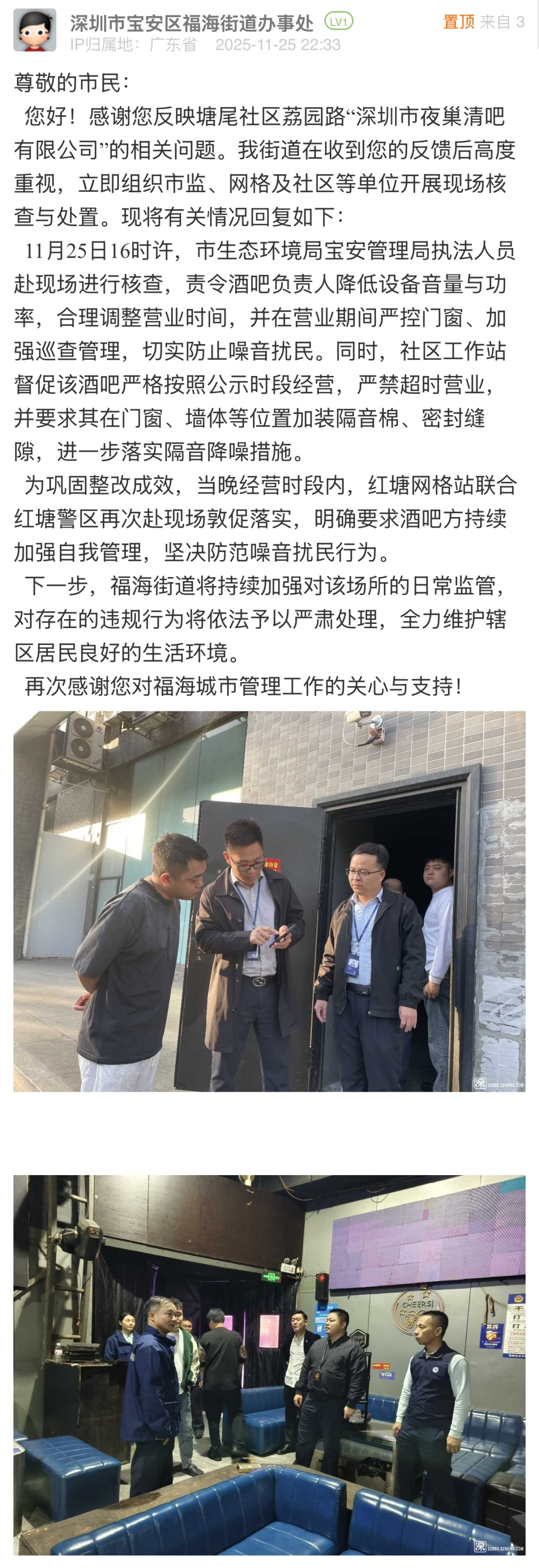 案例點(diǎn)評:針對市民反映的問題,福海街道辦與市生態(tài)環(huán)境局寶安管理局快速響應(yīng)、協(xié)同處置,在24小時(shí)內(nèi)組織工作人員開展線下核查,現(xiàn)場責(zé)令店鋪整改,嚴(yán)禁其超時(shí)營業(yè),并要求加裝隔音棉、密封縫隙,加強(qiáng)降噪。在發(fā)出整改要求當(dāng)晚,網(wǎng)格站聯(lián)合警區(qū)再次到現(xiàn)場復(fù)查,督促整改要求落實(shí),同時(shí)公開執(zhí)法圖片向公眾反饋處置進(jìn)展,有效回應(yīng)市民關(guān)切,體現(xiàn)了務(wù)實(shí)高效的工作作風(fēng)。