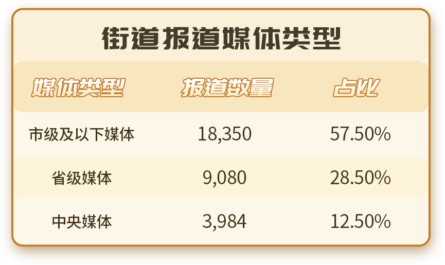 先看媒體類型,全年報道中,市級及以下媒體占比57.5%,省級媒體占比28.5%,兩者合計超過八成。也就是說,街道的大部分傳播,首先發(fā)生在區(qū)域媒體體系之中,被本地社會所看見、討論和接收。這樣的分布并不意外。街道離居民最近,日常工作也最貼近城市運行的細部肌理,無論是基層治理、社區(qū)服務,還是環(huán)境整治、民生保障,本身都帶有很強的屬地屬性,天然更容易進入本地媒體的觀察視野。
